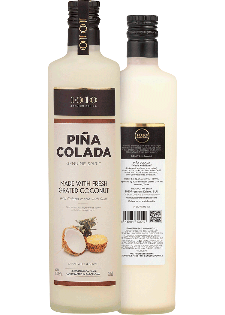 Spain- 1010 Pina Colada is an exciting cocktail made with rum aged for 3 years, cane sugar, milk, pineapple, and 100% natural coconut. Round and light body with a slightly sweet touch in every sip. Aromatic with tasty notes of pineapple and coconut. Perfectly refreshing and elegant!