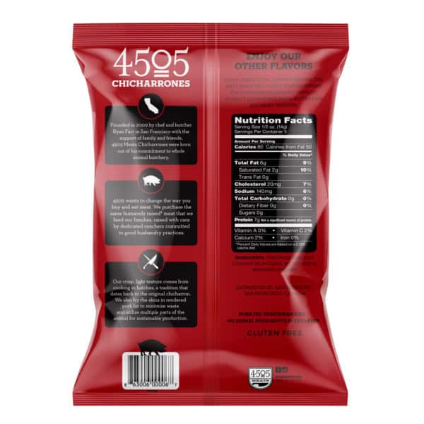 0 g total carb per serving. Certified Paleo. www.paleofoundation.com. Gluten-free and Paleo certified. Crispy clouds of porkaliciousness. Go pig or go home. Humanely raised (Pork raised on family farms in a stress free environment that produces natural behavior and socialization) without added antibiotic or added hormones (Federal regulations prohibit the use of hormones in pork). Founded in 2009 by chef and butcher Ryan Farr in San Francisco with the support of family and friends, 4505 Meats Chicharrones were born out of his commitment to whole animal butchery. 4505 wants to change the way you buy and eat meat. We purchase the same humanely raised (Pork raised on family farms in a stress free environment that produces natural behavior and socialization) meat that we feed our family, raised with care by dedicated ranchers committed to good husbandry practices. Our crisp, light texture comes from cooking in batches, a tradition that dates to the original chicharron. We also fry the skins in rendered pork fat to minimize waste and utilize multiple parts of the animal for sustainable production. With 0 g total carb per serving, this salty and spicy snack will satisfy your hankering for something deliciously crunchy without slowing you down. Pork raised without added hormones (Federal regulations prohibit the use of hormones in pork). Pork fed vegetarian diet, no animal by-products in feed ever. US inspected and passed by Department of Agriculture. 4505meats.com. Facebook. Instagram. Enjoy our Other Flavors: BBQ Seasoned. Jalapeno Cheddar. Chef’d in San Francisco. Made in the USA.