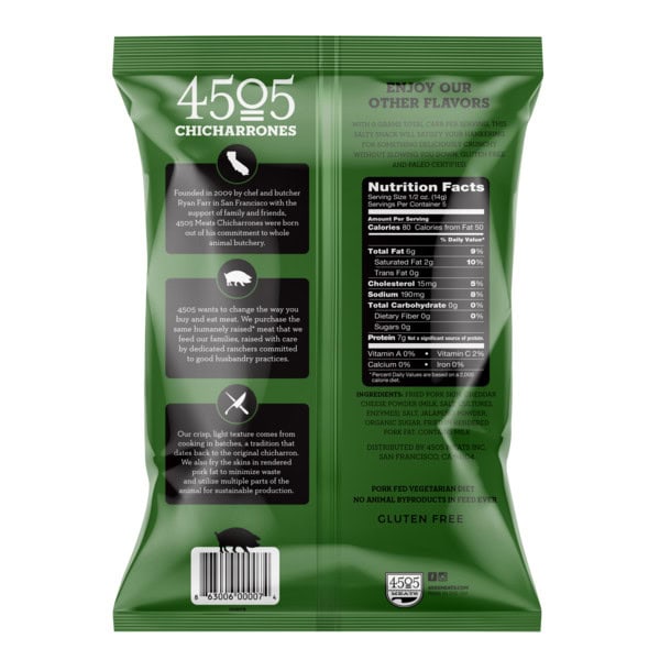 0 g total carb per serving. Gluten-free. Crispy clouds of porkaliciousness. Go pig or go home. Humanely raised (Pork raised on family farms in a stress free environment that produces natural behavior and socialization) without added antibiotic or added hormones (Federal regulations prohibit the use of hormones in pork). Chef’d in San Francisco. Founded in 2009 by chef and butcher Ryan Farr in San Francisco with the support of family and friends, 4505 Meats Chicharrones were born out of his commitment to whole animal butchery. 4505 wants to change the way you buy and eat meat. We purchase the same humanely raised (Pork raised on family farms in a stress free environment that produces natural behavior and socialization) meat that we feed our family, raised with care by dedicated ranchers committed to good husbandry practices. Our crisp, light texture comes from cooking in batches, a tradition that dates to the original chicharron. We also fry the skins in rendered pork fat to minimize waste and utilize multiple parts of the animal for sustainable production. With 0 g total carb per serving, this salty and spicy snack will satisfy your hankering for something deliciously crunchy without slowing you down. Pork raised without added hormones (Federal regulations prohibit the use of hormones in pork). Pork fed vegetarian diet, no animal by-products in feed ever. US inspected and passed by Department of Agriculture. 4505meats.com. Facebook. Instagram. Enjoy our Other Flavors: Classic Chili & Salt; BBQ Seasoned. Chef’d in San Francisco. Made in the USA.