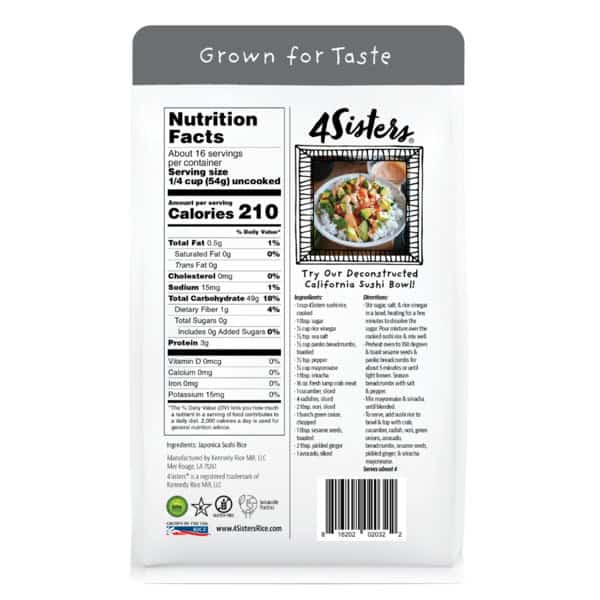 4Sisters Authentic Short Grain Japonica Rice is more than just a pantry staple..it’s the foundation for perfectly balanced, comforting meals inspired by Japanese tradition. Grown with care and precision, this premium Japonica rice is known for its short, round grains, soft texture, and naturally sticky consistency when cooked. Our short grain japonica rice is non-GMO and gluten-free delivers a subtle, slightly sweet flavor and tender bite that make it ideal for sushi, rice bowls, and other Asian-inspired dishes. Its signature stickiness also makes it a great choice for simple sides or hearty, home-cooked meals that call for satisfying texture and versatility. Whether used in homemade sushi rolls, paired with grilled fish or tofu, or served in warm rice porridge, this premium Japanese-style rice brings authentic taste and wholesome quality to your kitchen. At 4Sisters, we believe that great meals start with responsibly sourced ingredients your family can feel good about.