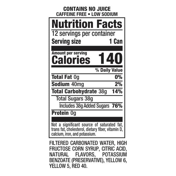 Filtered Carbonated Water, High Fructose Corn Syrup, Citric Acid, Natural Flavors, Potassium Benzoate (preservative), Yellow 6, Yellow 5, Red 40