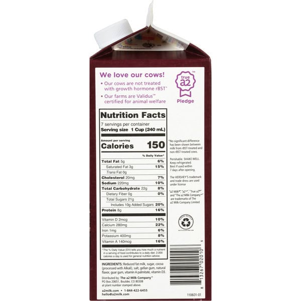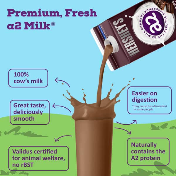 A match made in chocolate heaven, HERSHEY’S a2 Milk is creamy, chocolatey real milk. Your family will love that it tastes just like their favorite chocolate treat, and you’ll love the simple ingredients like classic HERSHEY’S cocoa and a2 Milk with no artificial sweeteners or flavors.