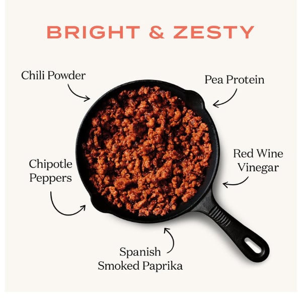 Filtered Water, Pea Protein*, Tomato Paste, Extra Virgin Olive Oil, Red Wine Vinegar, Onion Powder, Chili Powder (chili Pepper, Cumin Salt, Oregano, Garlic, Coriander), Spanish Smoked Paprika, Sea Salt, Garlic Powder, Cumin, Vinegar, Black Pepper, Oregano, Chipotle Peppers.