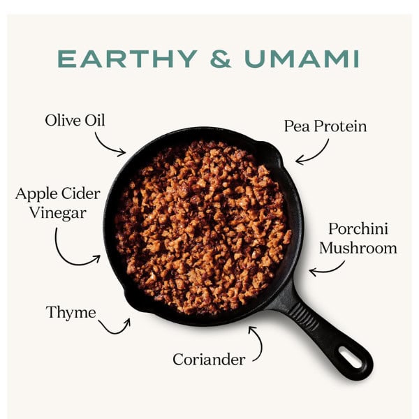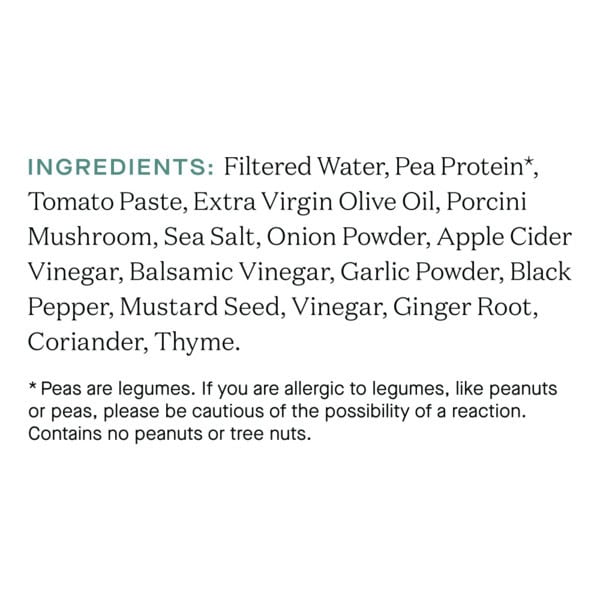 Filtered Water, Pea Protein*, Tomato Paste, Extra Virgin Olive Oil, Porcini Mushroom, Sea Salt, Onion Powder, Apple Cider Vinegar, Balsamic Vinegar, Garlic Powder, Black Pepper, Mustard Seed, Vinegar, Ginger Root, Coriander, Thyme.