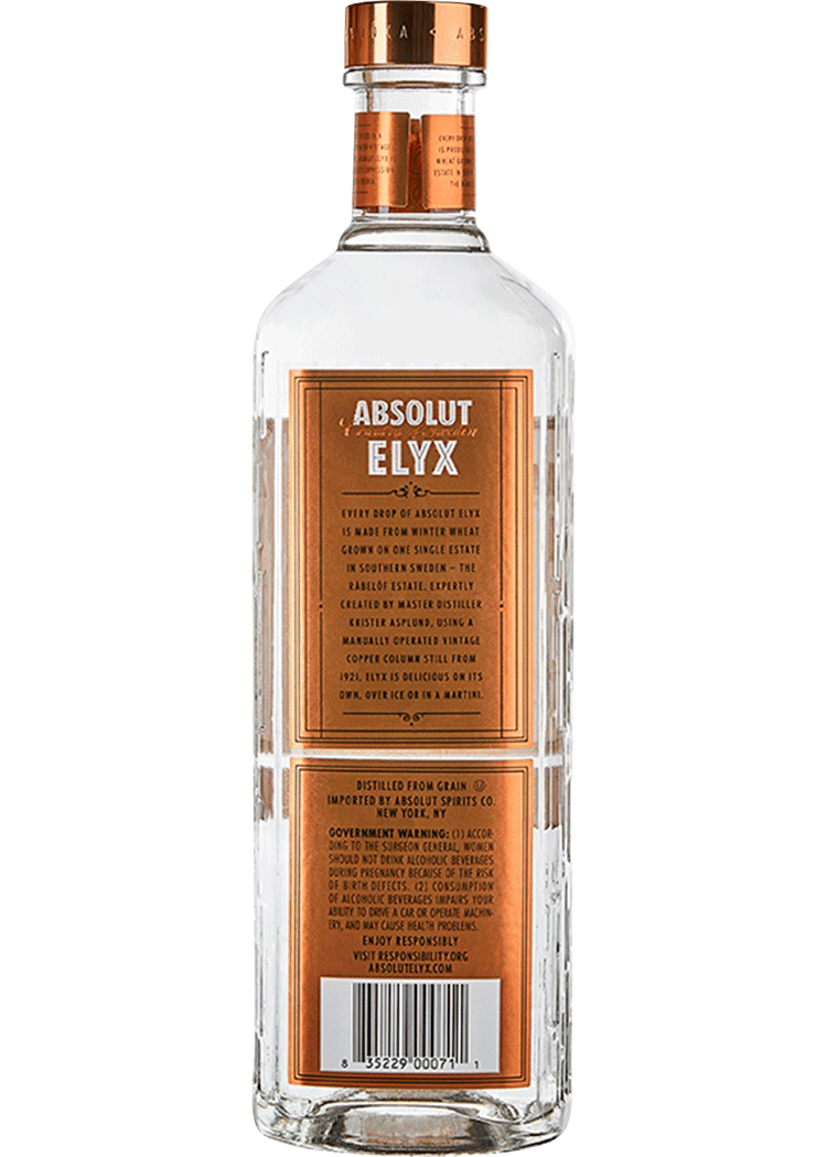 Sweden- ABSOLUT ELYX is manually distilled in a 1921 copper rectification still. Operated by a select few who inherited their knowledge and expertise from past generations. This silky textured vodka is a result of single estate wheat, manual operation and the old copper catalyzation.