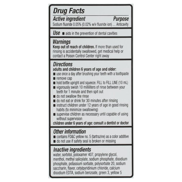 Directions: Important: Read directions for proper use. Adults and Children 6 Years of Age and Older: Use once a day after brushing your teeth with a toothpaste; remove cap; hold bottle upright and squeeze. Fill to fill line (10 mL); vigorously swish 10 milliliters of rinse between your teeth for 1 minute and then spit out; do not swallow the rinse; do not eat or drink for 30 minutes after rinsing; instruct children under 12 years of age in good rinsing habits (to minimize swallowing); supervise children as necessary until capable of using without supervision. Children Under 6 Years of Age: Consult a dentist or doctor.