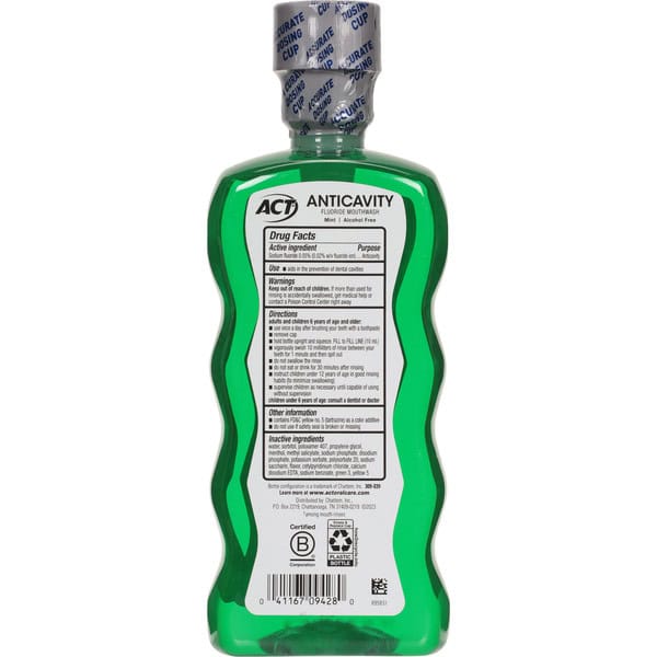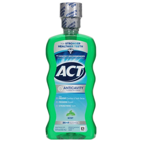 Zero alcohol. Alcohol free. No. 1 Dentist recommended fluoride brand (among mouth rinses). Helps prevent cavities. Strengthens teeth. Freshens breath. ADA Accepted. American Dental Association. Learn more at www.actfluoride.com.