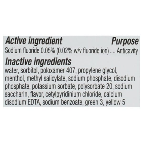Water, Sorbitol, Poloxamer 407, Propylene Glycol, Menthol, Methyl Salicylate, Sodium Phosphate, Disodium Phosphate, Potassium Sorbate, Polysorbate 20, Sodium Saccharin, Flavor, Cetylpyridinium Chloride, Calcium Disodium Edta, Sodium Benzoate, Green 3, Yellow 5