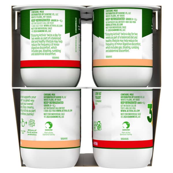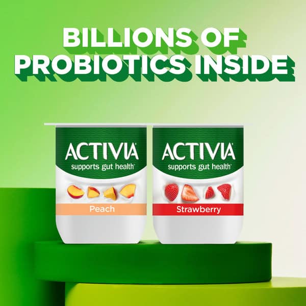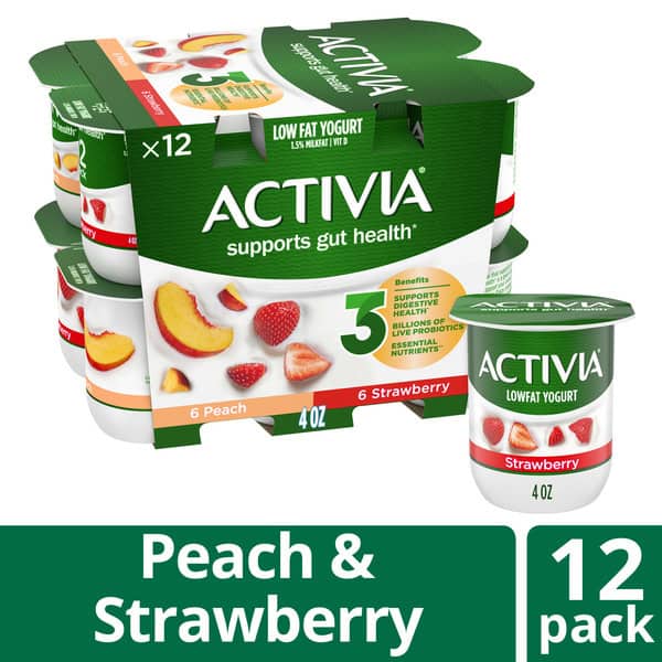Start every day with Activia Probiotic Peach and Strawberry Lowfat Yogurt Cups, as part of your routine, from the #1 doctor-recommended probiotic brand.*** Every spoonful is full of delicious fruit flavor and creamy texture. Plus, each serving is packed with our proprietary blend of live and active cultures and our exclusive probiotic. Probiotics are the living microorganisms that have been studied and shown to provide specific health benefits, including supporting gut health.* Activia yogurt contains Bifidobacterium lactis DN 173-010/CNCM I-2494, which has been studied and shown to survive passage through the gastrointestinal tract. Making Activia probiotic yogurt a part of your day is an easy way to help support your gut health. Grab an Activia probiotic yogurt for an easy and delicious breakfast, prepare a yogurt smoothie or enjoy one in the afternoon as an on the go snack. Your gut is where it all begins. Start with an Activia Probiotic Lowfat Yogurt. *Enjoying Activia twice a day for two weeks as part of a balanced diet and healthy lifestyle may help reduce the frequency of minor digestive discomfort, which includes bloating, gas, abdominal discomfort & rumbling. **Contains 10% DV of calcium & vitamin D per serving. ***Based on a 2024 national weighted survey of 300 doctors.