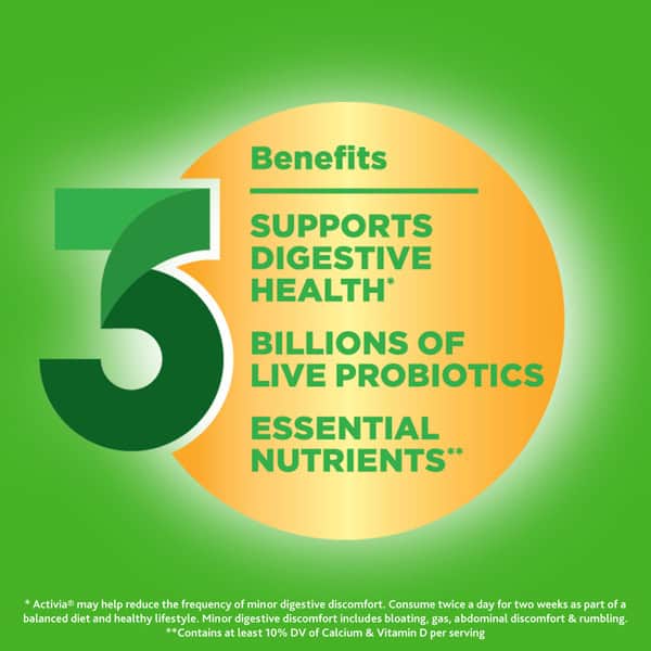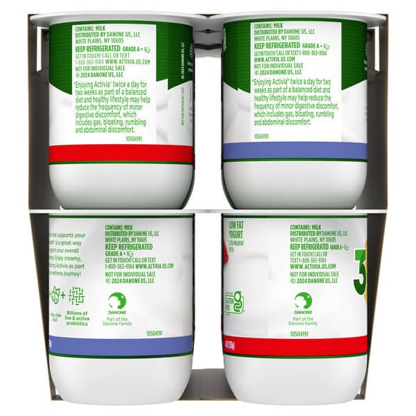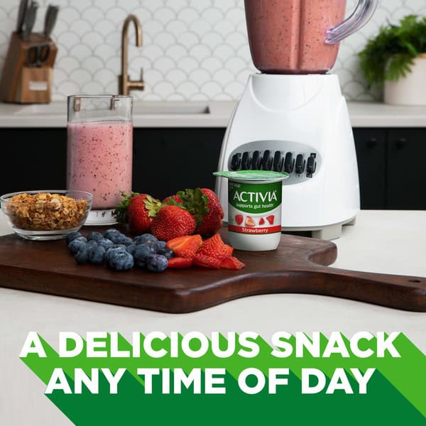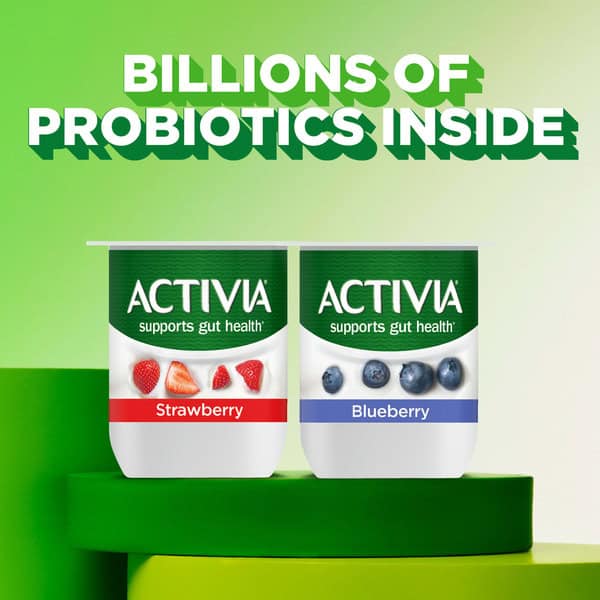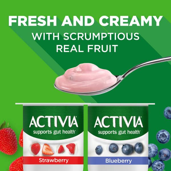 Start every day with Activia Probiotic Strawberry and Blueberry Lowfat Yogurt Cups, as part of your routine, from the #1 doctor-recommended probiotic brand.*** Every spoonful is full of delicious fruit flavor and creamy texture. Plus, each serving is packed with our proprietary blend of live and active cultures and our exclusive probiotic. Probiotics are the living microorganisms that have been studied and shown to provide specific health benefits, including supporting gut health.* Activia yogurt contains Bifidobacterium lactis DN 173-010/CNCM I-2494, which has been studied and shown to survive passage through the gastrointestinal tract. Making Activia probiotic yogurt a part of your day is an easy way to help support your gut health. Grab an Activia strawberry or blueberry yogurt for an easy and delicious breakfast, prepare a yogurt smoothie or enjoy one in the afternoon as an on the go snack. Your gut is where it all begins. Start with an Activia Probiotic Lowfat Yogurt. *Enjoying Activia twice a day for two weeks as part of a balanced diet and healthy lifestyle may help reduce the frequency of minor digestive discomfort, which includes bloating, gas, abdominal discomfort & rumbling. **Contains 10% DV of calcium & vitamin D per serving. ***Based on a 2024 national weighted survey of 300 doctors.