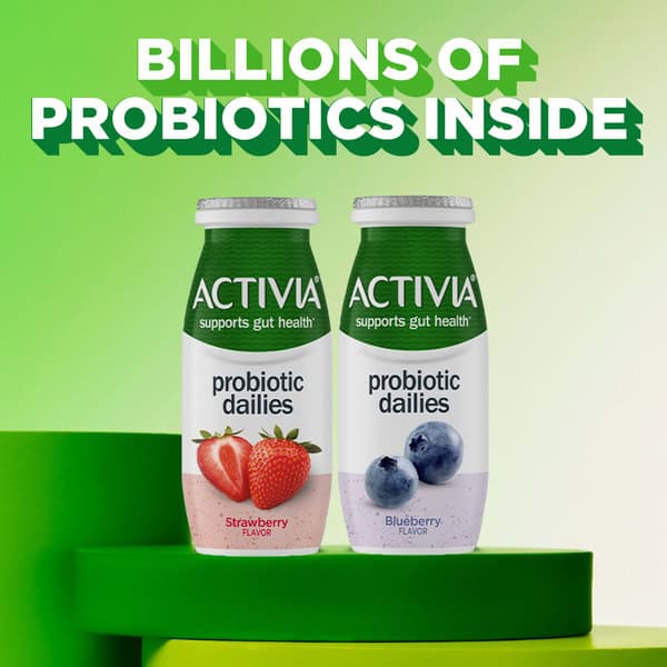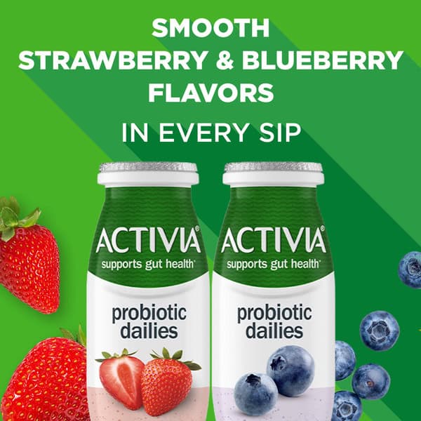 • MOVES WITH YOU: Pack of eight 3.1 fl oz bottles of Activia Probiotic Dailies Strawberry and Blueberry Lowfat Yogurt Drink – a quick, easy way to help you get your daily probiotics