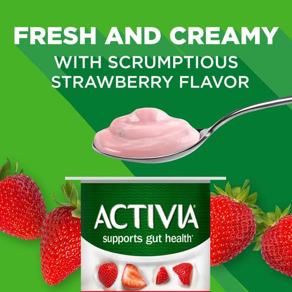 Start every day with Activia Probiotic Strawberry Lowfat Yogurt Cups, as part of your routine, from the #1 doctor-recommended probiotic brand.*** Every spoonful is full of delicious strawberry flavor and creamy texture. Plus, each serving is packed with our proprietary blend of live and active cultures and our exclusive probiotic. Probiotics are the living microorganisms that have been studied and shown to provide specific health benefits, including supporting gut health.* Activia yogurt contains Bifidobacterium lactis DN 173-010/CNCM I-2494, which has been studied and shown to survive passage through the gastrointestinal tract. Making Activia probiotic yogurt a part of your day is an easy way to help support your gut health. Grab an Activia strawberry yogurt for an easy and delicious breakfast or enjoy one in the afternoon as an on the go snack. Your gut is where it all begins. Start with an Activia Probiotic Lowfat Yogurt. *Enjoying Activia twice a day for two weeks as part of a balanced diet and healthy lifestyle may help reduce the frequency of minor digestive discomfort, which includes bloating, gas, abdominal discomfort & rumbling. **Contains 10% DV of calcium & vitamin D per serving. ***Based on a 2024 national weighted survey of 300 doctors.