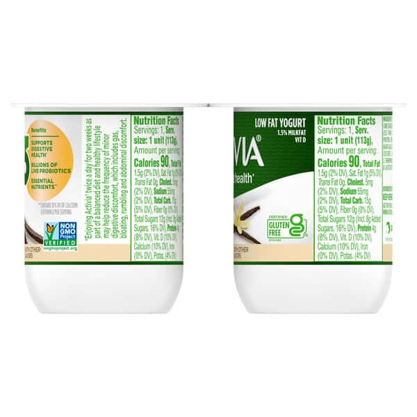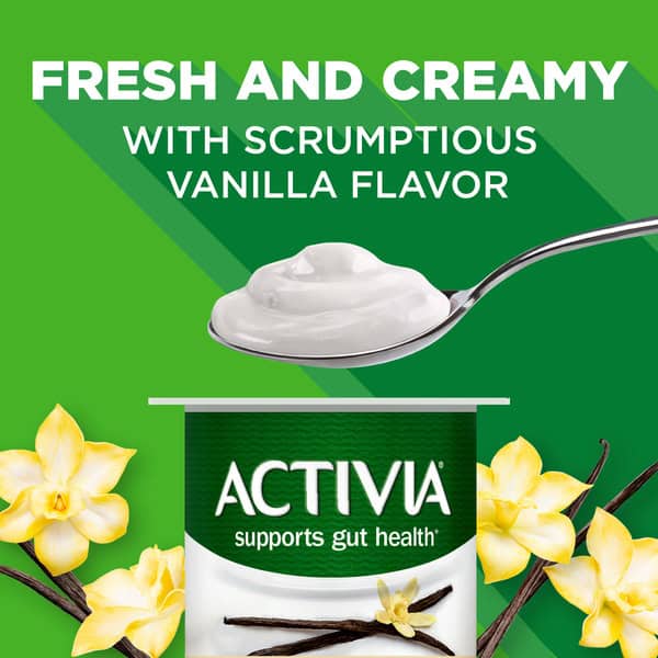 Start every day with Activia Probiotic Vanilla Lowfat Yogurt Cups, as part of your routine, from the #1 doctor-recommended probiotic brand.*** Every spoonful is full of delicious vanilla flavor and creamy texture. Plus, each serving is packed with our proprietary blend of live and active cultures and our exclusive probiotic. Probiotics are the living microorganisms that have been studied and shown to provide specific health benefits, including supporting gut health.* Activia yogurt contains Bifidobacterium lactis DN 173-010/CNCM I-2494, which has been studied and shown to survive passage through the gastrointestinal tract. Making Activia probiotic yogurt a part of your day is an easy way to help support your gut health. Grab an Activia vanilla yogurt for an easy and delicious breakfast or enjoy one in the afternoon as an on the go snack. Your gut is where it all begins. Start with an Activia Probiotic Lowfat Yogurt. *Enjoying Activia twice a day for two weeks as part of a balanced diet and healthy lifestyle may help reduce the frequency of minor digestive discomfort, which includes bloating, gas, abdominal discomfort & rumbling. **Contains 10% DV of calcium & vitamin D per serving. ***Based on a 2024 national weighted survey of 300 doctors.