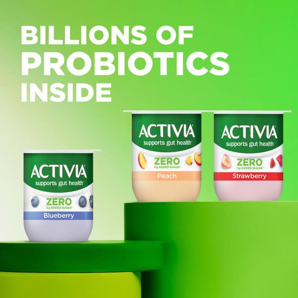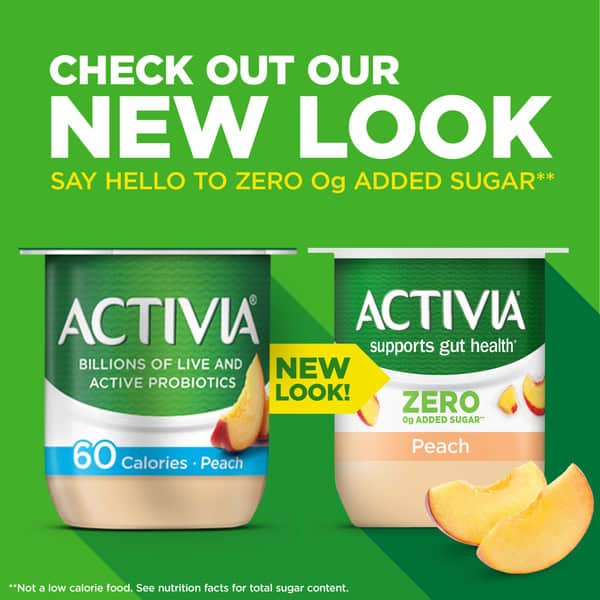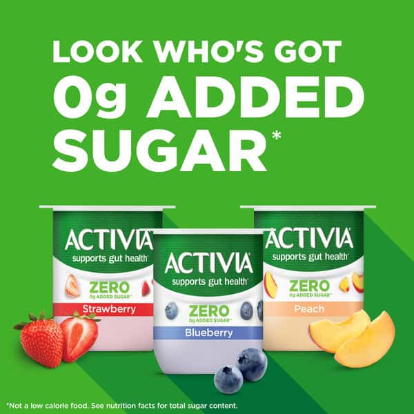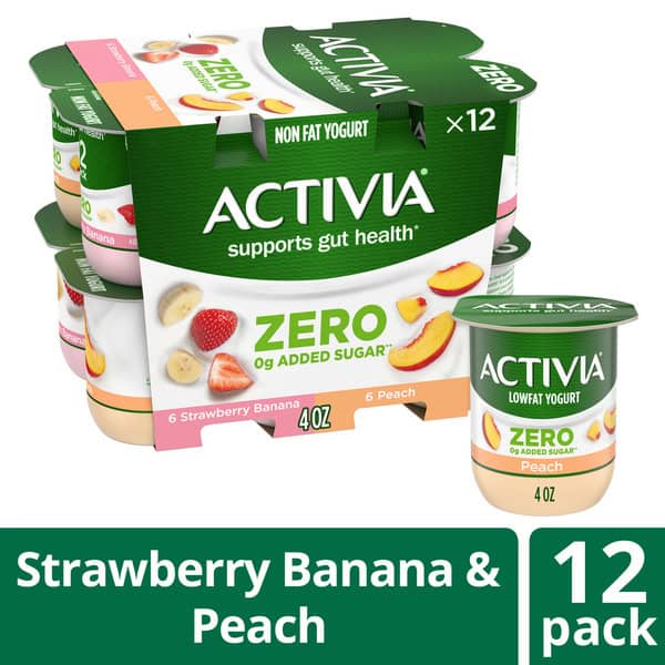• DELICIOUS STRAWBERRY BANANA AND PEACH: Pack of twelve 4 oz snack cups of Activia Zero 0g Added Sugar* Probiotic Nonfat Yogurt with strawberry banana and peach flavor