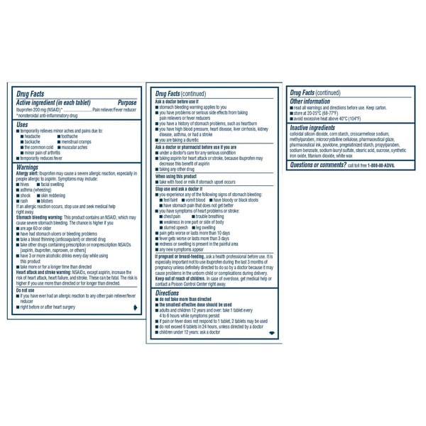 Advil stops pain where it starts, providing a powerful pain reliever. Whether you have a headache, muscle ache, backache, toothache, menstrual pain, minor arthritis and other joint pain, or aches and pains from the common cold, Advil brings relief where you need it. This pain medicine and fever reducer is scientifically designed to block the chemicals in the body that cause pain and fever. Each tablet contains ibuprofen 200mg, a non-steroidal anti-inflammatory drug (NSAID). Coated Advil tablets are easy to swallow, providing relief that lasts for up to 6 hours. One Advil is all it often takes for headache relief, muscle ache relief, joint pain relief or minor arthritis pain relief, and the medicine in Advil is what doctors use most for their own aches and pains. The world’s best-selling ibuprofen brand, Advil has provided safe, effective pain relief for over 35 years. By 2022, Advil will feature more sustainable packaging made with 20% less plastic per bottle, to keep nearly 500,000 pounds of plastic out of landfills. Nothing’s stronger on tough pain than Advil.*