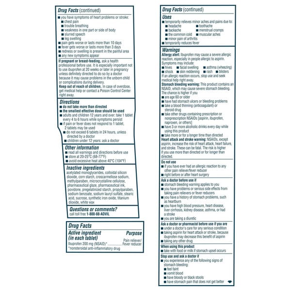Advil stops pain where it starts, providing a powerful pain reliever. Whether you have a headache, muscle ache, backache, toothache, menstrual pain, minor arthritis and other joint pain, or aches and pains from the common cold, Advil brings relief where you need it. This pain medicine and fever reducer is scientifically designed to block the chemicals in the body that cause pain and fever. Each tablet contains ibuprofen 200mg, a non-steroidal anti-inflammatory drug (NSAID). Coated Advil tablets are easy to swallow, providing relief that lasts for up to 6 hours. One Advil is all it often takes for headache relief, muscle ache relief, joint pain relief or minor arthritis pain relief, and the medicine in Advil is what doctors use most for their own aches and pains. The world’s best-selling ibuprofen brand, Advil has provided safe, effective pain relief for over 35 years. By 2022, Advil will feature more sustainable packaging made with 20% less plastic per bottle, to keep nearly 500,000 pounds of plastic out of landfills. Nothing’s stronger on tough pain than Advil.*