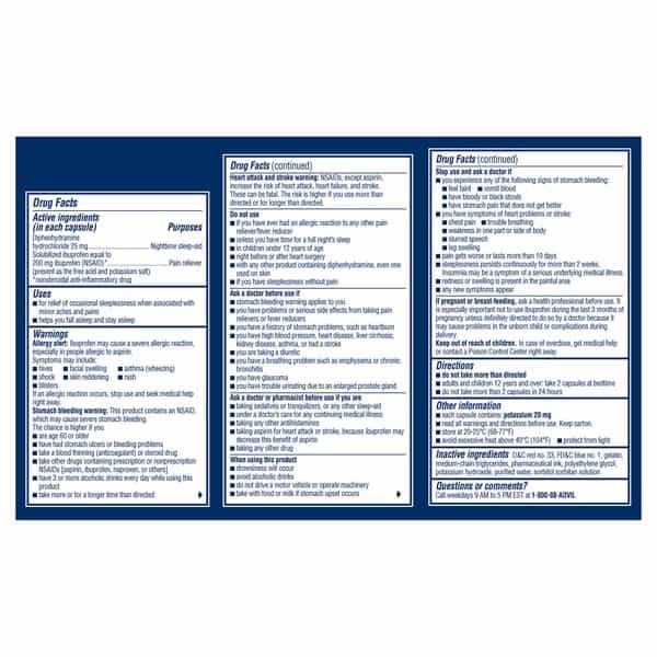 Heart attack and stroke warning: NSAIDs, except aspirin, increase the risk of heart attack, heart failure, and stroke. These can be fatal. The risk is higher if you use more than directed or for longer than directed. redness or swelling is present in the painful area any new symptoms appear. Allergy alert: Ibuprofen may cause a severe allergic reaction, especially in people allergic to aspirin. Symptoms may include: hives facial swelling asthma (wheezing) shock skin reddening rash blisters If an allergic reaction occurs, stop use and seek medical help right away. Stop use and ask a doctor if you experience any of the following signs of stomach bleeding: I feel faint vomit blood have bloody or black stools I have stomach pain that does not get better Iyou have symptoms of heart problems or stroke: chest pain trouble breathing I weakness in one part or side of body. Keep out of reach of chlldren. In case of overdose, get medical help or contact a Poison Control Center right away. Ask a doctor before use If stomach bleeding warning applies to you you have problems or serious side effects from taking pain relievers or fever reducers you have a history of stomach problems, such as heartburn you have high blood pressure, heart disease, liver cirrhosis, kidney disease, asthma, or had a stroke you are taking a diuretic I you have a breathing problem such as emphysema or chronic bronchitis you have glaucoma you have trouble urinating due to an enlarged prostate gland Ask a doctor or pharmacist before use If you are taking sedatives or tranquilizers, or any other sleep-aid under a doctor’s care for any continuing medical illness taking any other antihistamines 1 taking aspirin for heart attack or stroke, because ibuprofen may decrease this benefit of aspirin taking any other drug When using this product drowsiness will occur 1 avoid alcoholic drinks I do not drive a motor vehicle or operate machinery take with food or milk if stomach upset occurs. Do not use if you have ever had an allergic reaction to any other pain reliever/fever reducer I unless you have time for a full night’s sleep in children under 12 years of age right before or after heart surgery with any other product containing diphenhydramine, even one used on skin if you have sleeplessness without pain. Slurred speech leg swelling I pain gets worse or lasts more than 10 days sleeplessness persists continuously for more than 2 weeks. If pregnant or breast-feeding, ask a health professional before use. It is especially important not to use ibuprofen during the last 3 months of pregnancy unless definitely directed to do so by a doctor because it may cause problems in the unborn child or complications during delivery. Stomach bleeding warning: This product contains an NSAID, which may cause severe stomach bleeding. The chance is higher if you I are age 60 or older have had stomach ulcers or bleeding problems take a blood thinning (anticoagulant) or steroid drug take other drugs containing prescription or nonprescription NSAIDs [aspirin, ibuprofen, naproxen, or others] I have 3 or more alcoholic drinks every day while using this product take more or for a longer time than directed.