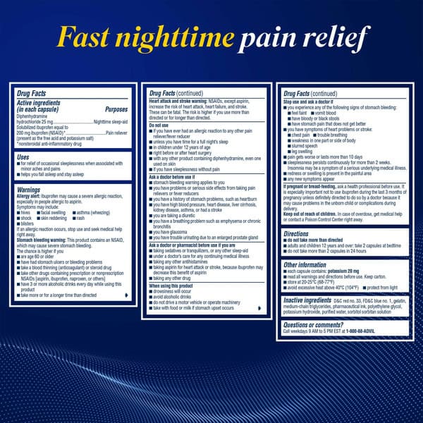 Advil PM Liqui-Gels Pain Reliever and Nighttime Sleep Aid combine the #1 ibuprofen brand plus the #1 sleep ingredient to give you fast pain relief and a whole night’s sleep. Whether you have occasional muscle aches, a backache, a toothache or minor arthritis pain, these non-habit forming Advil Liqui-Gels help relieve occasional sleeplessness associated with minor aches and pains. Each liquid filled capsule contains ibuprofen 200mg, a minor arthritis relief, headache relief and joint pain relief medication. This pain PM medicine also contains diphenhydramine 25mg, a nighttime sleep aid that helps you fall asleep and stay asleep. These Advil PM pain relievers are convenient Diphenhydramine HCL and ibuprofen Liqui-Gels that deliver real liquid power to rush relief where it hurts and ease you into a better night’s sleep. Liqui-Gels are also easily portable, so you can get a good night’s sleep whether you’re at home or away. Advil PM pain reliever gives you the restful sleep you need, helping you fall asleep and stay asleep so your body can heal as you rest. By 2022, Advil will feature more sustainable packaging made with 20% less plastic per bottle, to keep nearly 500,000 pounds of plastic out of landfills. Advil PM. For a healing night’s sleep.