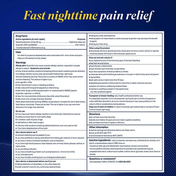 Do not use – if you have ever had an allergic reaction to any other pain reliever/fever reducer, unless you have time for a full night’s sleep, in children under 12 year of age, right before or after heart surgery, with any other product containing diphenhydramine, even one used on skin, if you have sleeplessness without pain. Ask a doctor or pharmacist before use if you are – taking sedatives or tranquilizers, or any other sleep-aid, under a doctor’s care for any continuing medical illness, taking any other antihistamines, taking aspirin for heart attack or stroke, because ibuprofen may decrease this benefit of aspirin, taking any other drug. Allergy alert: ibuprofen may cause a severe allergic reaction, especially in people allergic to aspirin. Symptoms may include: hives, asthma (wheezing), skin reddening, blisters, facial swelling, shock, rash, if an allergic reaction occurs, stop use and seek medical help right away. Stop use and ask a doctor if – you experience any of the following signs of stomach bleeding: feel faint, vomit blood, have bloody or black stools, have stomach pain that does not get better, pain gets worse or lasts more than 10 days, sleeplessness persists continuously for more than 2 weeks. Insomnia may be a symptom of a serious underlying medical illness. Redness or swelling is present in the painful area, any new symptoms appear. When using this product – drowsiness will occur, avoid alcoholic drinks, do not drive a motor vehicle or operate machinery, take with food or milk if stomach upset occurs, the risk of heart attack or stroke may increase if you use more than directed or for longer than directed. If pregnant or breast-feeding, ask a health professional before use. It is especially important not to use ibuprofen during the last 3 months of pregnancy unless definitely directed to do so by a doctor because it may cause problems in the unborn child or complications during delivery. Keep out of reach of children. In case of overdose, get medical help or contact a poison control center right away. Stomach bleeding warning: this product contains an nsaid, which may cause severe stomach bleeding. The chance is higher if you – are age 60 or older, have had stomach ulcers or bleeding problems, take a blood thinning (anticoagulant) or steroid drug, take other drugs containing prescription or nonprescription nsaid’s [aspirin, ibuprofen, naproxen, or others], have 3 or more alcoholic drinks every day while using this product, take more or for a longer time than directed. Ask a doctor before use if – stomach bleeding warning applies to you, you have problems or serious side effects from taking pain relievers or fever reducers, you have a history of stomach problems, such as heartburn, you have high blood pressure, heart disease, liver cirrhosis, kidney disease, or asthma, you are taking a diuretic, you have a breathing problem such as emphysema or chronic bronchitis, you have glaucoma, you have trouble urinating due to an enlarged prostate gland.
