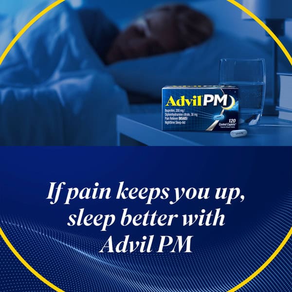 Advil PM Pain Reliever and Nighttime Sleep Aid combines the #1 ibuprofen brand plus the #1 sleep ingredient to give you fast pain relief and a whole night’s sleep.* Whether you have occasional muscle aches, a backache, a toothache or minor arthritis pain, these non-habit forming Advil caplets help relieve occasional sleeplessness associated with minor aches and pains. Each caplet contains ibuprofen 200mg, a minor arthritis relief, headache relief and joint pain relief medication that relieves pain at the site of inflammation. This pain PM medicine also contains diphenhydramine citrate 38mg, a nighttime sleep aid that helps you fall asleep and stay asleep. Advil PM pain relievers come in a convenient caplet form that is easily portable, so you can get a good night’s sleep whether you’re at home or away. Advil PM gives you the restful sleep you need, helping you fall asleep and stay asleep so your body can heal as you rest. By 2022, Advil will feature more sustainable packaging made with 20% less plastic per bottle, to keep nearly 500,000 pounds of plastic out of landfills. Advil PM. For a healing night’s sleep.