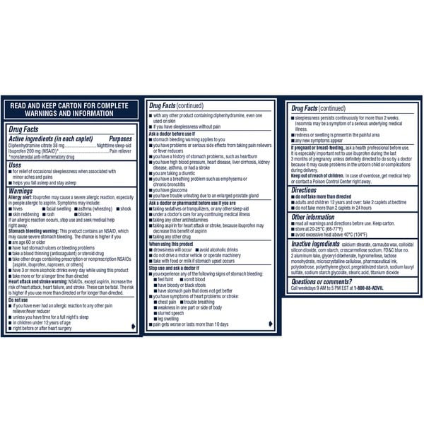 Ask a doctor before use if, stomach bleeding warning applies to you, you have problems or serous side effects from taking pain relievers or fever reducers, you have a history of stomach problems, such as heartburn, you have high blood pressure, heart disease, liver cirrhosis, kidney disease, or asthma, you are taking a diuretic, you have a breathing problem such as emphysema or chronic bronchitis, you have glaucoma, you have trouble urinating due to an enlarged prostate gland. Do not use, if your have even had an allergic reaction to any other pain reliever/fever reducer, unless you have time for a full night’s sleep, in children under 12 years of age, right before or after heart surgery, with any other product containing diphehydramine, even one used on skin, if your have sleeplessness without pain. When using this product: drowsiness will occur, avoid alcoholic drinks, do not drive a motor vehicle or operate machinery, take with food or milk if stomach upset occurs, the risk of heart attack or stroke may increase if you use more than directed or for longer than directed. Ask a doctor before use if: stomach bleeding warning applies to you, you have problems or serious side effects from taking pain relieves or fever reducers, you have a history of stomach problems, such as heartburn, you have high blood pressure, heart disease, liver cirrhosis, kidney disease, or asthma, you are taking a diuretic, you have a breathing problem such as emphysema or chronic bronchitis, you have glaucoma, you have a trouble urinating due to an enlarged prostate gland. Allergy alert: ibuprofen may cause a severe allergic reaction, especially in people allergic to aspirin., symptoms may include: hives, facial swelling, asthma (wheezing), shock, skin reddening, rash, blisters, if an allergic reaction occurs, stop use and seek medical help right away. Keep out of reach of children. In case of overdose, get medical help or contact a poison control center right away. Ask a doctor or pharmacist before use if you are: taking sedatives or tranquilizers, or any other sleep-aid, under a doctor’s care for any continuing medical illness taking any other antihistamines, taking aspirin for heart attack or stroke, because ibuprofen may decrease this beneficial of aspirin, taking any other drug. Ask a doctor or pharmacist before use if your are, taking sedatives or tranquilizers, or any other sleep-aid, under a doctor’s care for any continuing medical illness, taking any other antihistamines, taking aspirin for heart attack or stroke, because ibuprofen may decrease this benefit of aspirin, taking any other drug. Stomach bleeding warning: this product contains an nsaid, which may cause severe stomach bleeding. The chance is higher if you, are age 60 or older, have had stomach ulcers or bleeding problems, take a blood thinning (anticoagulant) or steroid drug,take other drugs containing prescription or nonprescription, nsaids [aspirin, ibuprofen, naproxen, or others], have 3 or more alcoholic drinks every day while using this product, take more or for a longer time than directed. Do not use: if you have ever had an allergic reaction to any other pain reliever/fever reducer, unless you have time for a full night’s sleep, in children under 12 years of age, right before or after heart surgery, with any other product containing diphenhydramine, even one use on skin, if you have sleeplessness without pain. Allergy alert: ibuprofen may cause a severe allergic reaction, especially in people allergic to aspirin. Symptoms may include: hives, facial swelling, asthma (wheezing) shock, skin reddening, rash, blisters, if an allergic reactions occurs, stop use and seek medical help right away., stomach bleeding warning: this product contains an nsaid, which may cause severe stomach bleeding. The chance is higher if you, are age 60 or older, have had stomach ulcers or bleeding problems, take a blood thinning (anticoagulant) or steroid drug, take other drugs containing prescription or nonprescription nsaids [asprirn, ibuprofen, naproxen, or others], have 3 or more alcoholic drinks every day white using this product, take more or for a longer time than directed. Stop use and ask a doctor if: you experience any of the following signs of stomach bleeding: feel faint, vomit blood, have bloody or black stools, have stomach pain that does not get better, pain gets worse or lasts more than 10 days, sleeplessness persists continuously for more than 2 weeks, insomnia may be a symptom of a serious underlying medical illness., redness or swelling is present in the painful area, any new symptoms appear. If pregnant or breast-feeding, ask a health professional before use. It is especially important not to use ibuprofen during the last 3 months of pregnancy unless definitely directed to do so by a doctor because it may cause problems in the unborn child or complications during delivery. If pregnant or breast-feeding, ask a health professional before use. It is especially important not to use ibuprofen during the last 3 months of pregnancy unless definitely directed to do so by a doctor because it may cause problems in the unborn child or complications during delivery. Keep out of reach of children. In case of overdose, get medical help or contact a poison control center right away.