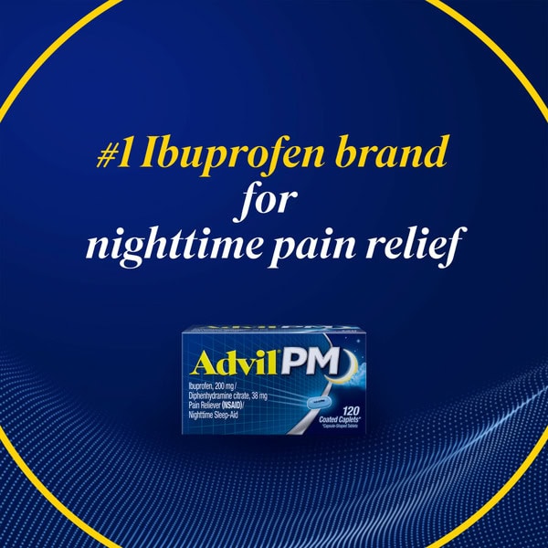 Advil PM Pain Reliever and Nighttime Sleep Aid combines the #1 ibuprofen brand plus the #1 sleep ingredient to give you fast pain relief and a whole night’s sleep.* Whether you have occasional muscle aches, a backache, a toothache or minor arthritis pain, these non-habit forming Advil caplets help relieve occasional sleeplessness associated with minor aches and pains. Each caplet contains ibuprofen 200mg, a minor arthritis relief, headache relief and joint pain relief medication that relieves pain at the site of inflammation. This pain PM medicine also contains diphenhydramine citrate 38mg, a nighttime sleep aid that helps you fall asleep and stay asleep. Advil PM pain relievers come in a convenient caplet form that is easily portable, so you can get a good night’s sleep whether you’re at home or away. Advil PM gives you the restful sleep you need, helping you fall asleep and stay asleep so your body can heal as you rest. By 2022, Advil will feature more sustainable packaging made with 20% less plastic per bottle, to keep nearly 500,000 pounds of plastic out of landfills. Advil PM. For a healing night’s sleep.