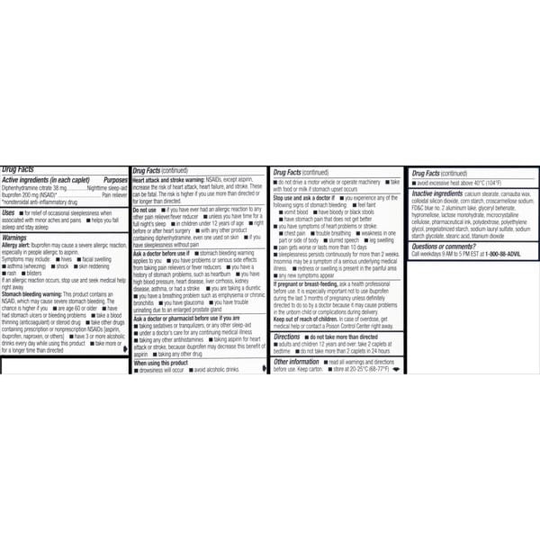When using this product drownsiness will occur, avoid alcoholic drinks. Ask a doctor before use if stomach bleeding warning applies to you have problems or serious side effects from taking pain relievers or fever reducers you have a history of stomach problems, such as heartburn, you have high blood pressure, heart disease, liver cirrhosis, kidney disease, asthma, or had a stroke you are taking a diuretic you have a breathing problem such as emphysema or chronic bronchitis you have glaucoma you have trouble urinating due to an enlarged prostate gland. Warnings Allergy alert: Ibuprofen may cause a severe allergic reaction, especially in people allergic to aspirin. Symptoms may include: hives facial swelling asthma (wheezing) shock skin reddening rash blisters If an allergic reaction occurs, stop use and seek medical help right away. Stomach bleeding warning: This product contains an NSAID, which may cause severe stomach bleeding. The chance is higher if you are age 60 or older have had stomach ulcers or bleeding problems take a blood thinning (anticoagulant) or steroid drug take other drugs containing prescription or nonprescription NSAIDs [aspirin, ibuprofen, naproxen, or others] have 3 or more alcoholic drinks every day while using this product take more or for a longer time than directed. Heart attack and stroke warning: NSAIDs, except aspirin, increase the risk of heart attack, heart failure, and stroke. These can be fatal. The risk is higher if you use more than directed or for longer than directed. Do not use if you have ever had an allergic reaction to any other pain reliever/fever reducer unless you have time for a full night’s sleep in children under 12 years of age right before or after heart surgery with any other product containing diphenhydramine, even one used on skin if you have sleepless without pain. Stop use and ask a doctor if you experience any of the following signs of stomach bleeding: feel faint vomit blood have bloody or black stools have stomach pain that does not get better you have symptoms of heart problems or stroke: chest pain trouble breathing weakness in one part or side of body slurred speech leg swelling pain gets worse or lasts more than 10 days sleeplessness persist continuously for more than 2 weeks. Insomnia may be a symptom of a serious underlying medical illness. redness or sweeling is present in the painful area any new symptoms appear. do not drive a motor vehicle or operate machinery take with food or milk if stomach upset occurs. If pregnant or breast-feeding, ask a health professional before use. It is especially important not to use ibuprofen during the last 3 months of pregnancy unless definitely directed to do so by a doctor because it may cause problems in the unborn child or complications during delivery. Keep out of reach of children. In case of overdose, get medical help or contact a Poison Control Center right away. Ask a doctor or pharmacist before use if you are taking sedatives or tranquilizers, or any other sleep-aid under a doctor’s care for any continuing medical illness taking any other antihistamines taking aspirin for heart attack or stroke, because ibuprofen may decreases this benefit of aspirin taking any other drug.