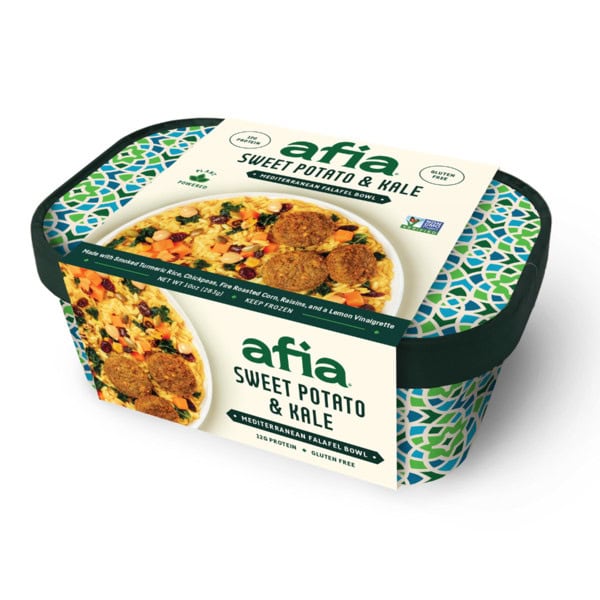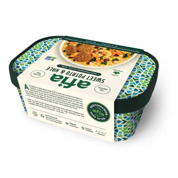 A sweet and savory bowl inspired by dried fruits and smokey turmeric rice used in dishes like Mandi. This warm, vibrant dish is made with 3 Afia Traditional Falafel on a bed of smoked turmeric rice with chickpeas, fire roasted corn, kale, sweet potatoes, raisons, cranberries, pumpkin seeds and a lemon vinaigrette dressing.
