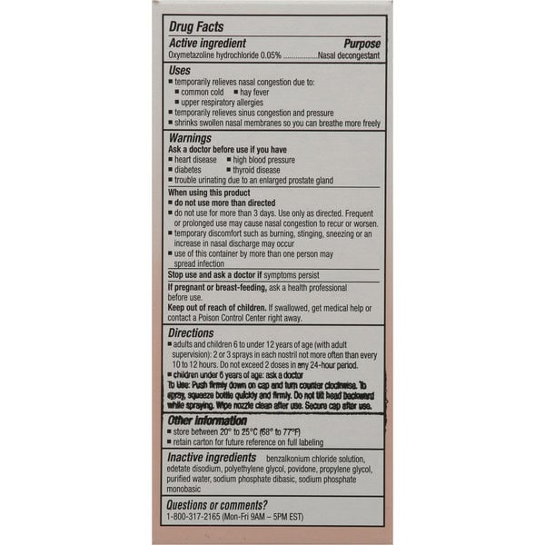 If pregnant or breast-feeding, ask a health professional before use. Keep out of reach of children. If swallowed, get medical help or contact a poison control center right away. Stop use and ask a doctor if symptoms persist. Ask a doctor before use if you have: heart disease, high blood pressure, diabetes, thyroid disease, trouble urinating due to an enlarged prostate gland. When using this product: do not use more than directed, do not use for more than 3 days. Use only as directed. Frequent or prolonged use may cause nasal congestion to recur or worsen. Temporary discomfort such as burning, stinging, sneezing or an increase in nasal discharge may occur, use of this container by more than one person may spread infection.