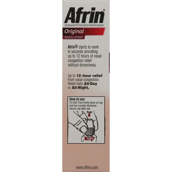 Other Information: Store between 20 degrees to 25 degrees C (68 degrees to 77 degrees F). Retain carton for future reference on full labeling. Oxymetazoline HCI nasal solution-nasal decongestant. Fast, powerful congestion relief. Colds. Allergies. Up to 12 hour relief. No. 1 Doctor & Pharmacist recommended nasal spray brand. Afrin starts to work in seconds providing up to 12 hours of nasal congestion relief without drowsiness. Up to 12-hour relief from nasal congestion. Relief lasts all-day or all-night. www.afrin.com. Questions or comments? 1-800-317-2165 (Mon-Fri 9 am – 5 pm EST). 100% recycled paperboard. Product of Germany.
