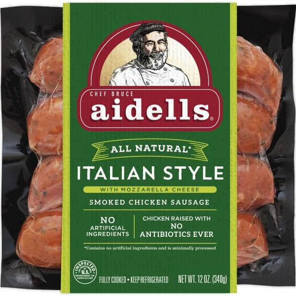 Enjoy the delicious flavors of Italy with Aidells® Italian Style with Mozzarella Cheese Smoked Chicken Sausage. Made with mozzarella cheese, roasted garlic, and hardwood smoked chicken, this all-natural* sausage is rich and savory with a hint of freshness from real basil. Simply sauté with penne pasta and a splash of olive oil for a flavorful dinner. Our Italian Style sausage is gluten-free and has no added nitrites, except for those naturally occurring in celery powder. For over 30 years, Aidells® chicken sausages have been handcrafted in small batches with care using only the freshest, most flavorful ingredients we can find. Our all-natural* sausages are stuffed by hand in natural casings with no fillers or binders and slow-smoked for hours over real hardwood chips for that snap we love. Though Aidells® has grown over the years, we still believe in doing things the way we always have: with extraordinary care and passion. *Minimally processed, no artificial ingredients