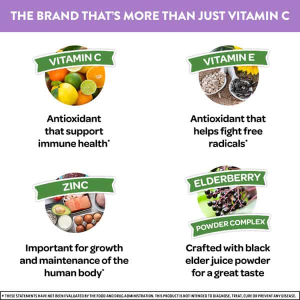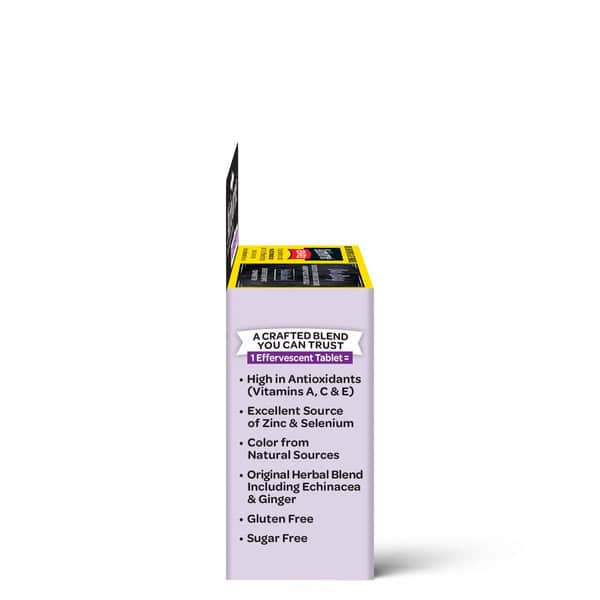 High in antioxidants (Vitamins A, C & E). Excellent source of zinc & selenium. Helps support your immune system. Crafted blend. Vitamin C + vitamins & zinc. Our Story: Developed by a former school teacher, Airborne products are a specially crafted blend designed to help support your immune system. A crafted blend you can trust. 1 Effervescent tablet = High in antioxidants (Vitamins A, C & E); Excellent source of zinc & selenium; Color from natural sources; Original herbal blend including echinacea & ginger.