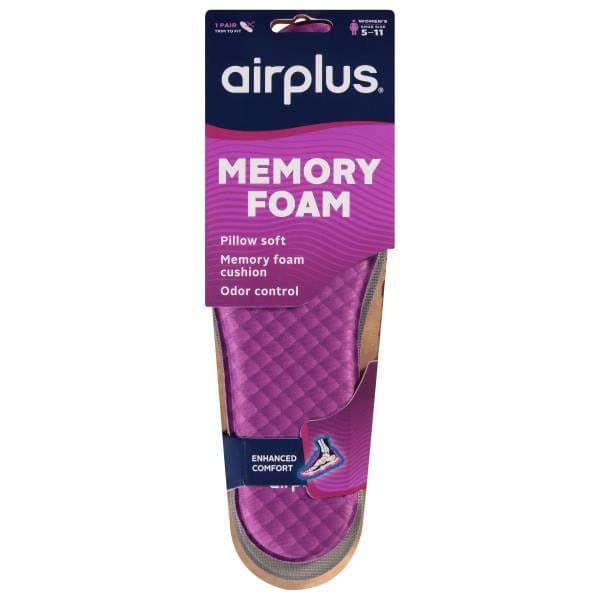 Personalized comfort. Durable and pillow soft. Anti-fatigue. Relieves foot pressure. Silvadur: The science of intelligent freshness. Super soft cushioning. Airplus memory comfort. Memory foam insole. The Airplus Memory Comfort Insole features responsive memory foam for targeted comfort. The insole molds to your foot, evenly distributing pressure over the surface of the foam, cushioning with every step. It is flexible and compact, fitting in most types of shoes or boots. The Memory Comfort Insole trims to fit most shoe sizes, creating truly customized relief. Trim to fit most shoe sizes. Premium memory foam increases comfort. To inhibit the growth of odor-causing bacteria. Slim design for compact cushioning. The Airplus Promise: If you are unsatisfied with your purchase, we offer a 30-day money-back guarantee. We also promise a 1-year warranty against manufacturer defects. Simply return this product to the address on the package with the original receipt for a full refund. Please allow 8-10 weeks for processing. airplusfootcare.com. We Stand for Comfort. Please recycle. Made in China.