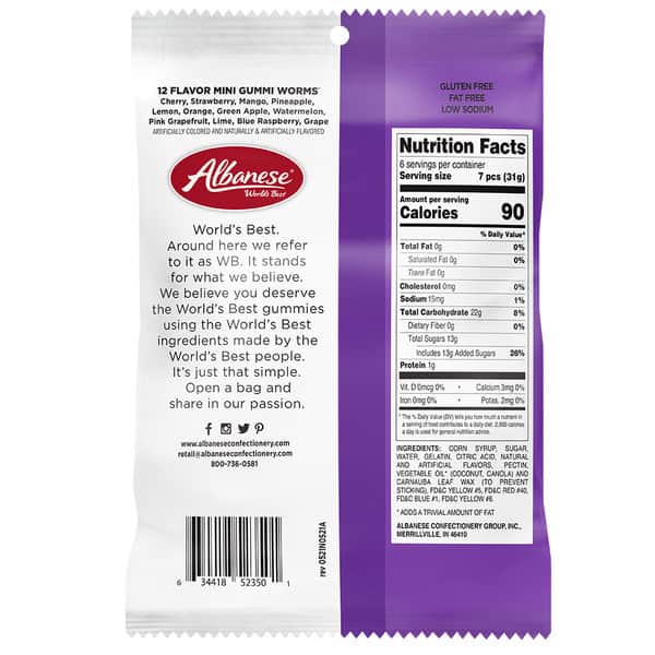 Corn Syrup, Sugar, Water, Gelatin, Citric Acid, Natural and Artificial Flavors, Pectin, Vegetable Oil* (Coconut, Canola) And Carnauba Leaf Wax (To Prevent Sticking), FD&C Yellow #5, FD&C Red #40, FD&C Blue #1, FD&C Yellow #6.