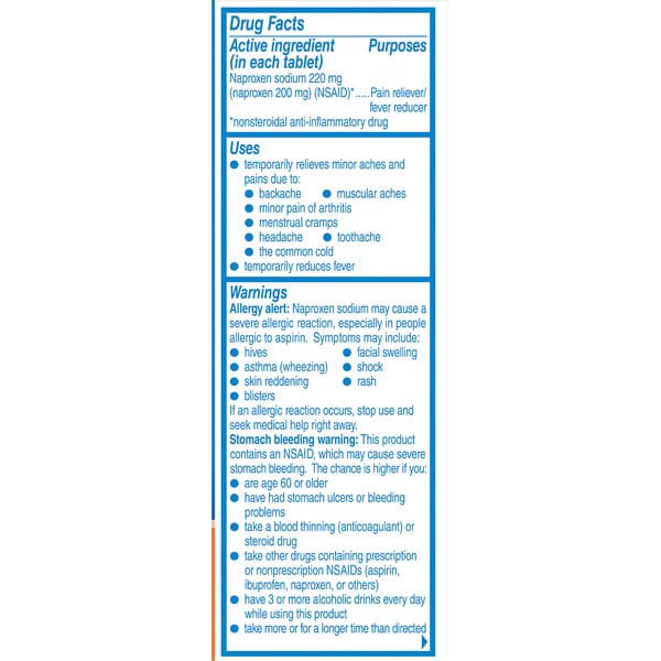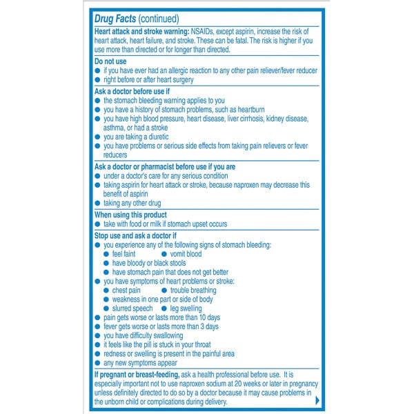 Heart attack and stroke warning: NSAIDS, except aspirin, increase the risk of heart attack, heart failure, and stroke. These can be fatal. The risk is higher if you use more than directed or for longer than directed. Do not use if you have ever had an allergic reaction to any other pain reliever/fever reducer right before or after heart surgery AÅŸk a doctor before use if the stomach bleeding warning applies to you you have a history of stomach problems, such as heartburn you have high blood pressure, heart disease, liver cirrhosis, kidney disease, asthma, or had a stroke you are taking a diuretic you have problems or serious side effects from taking pain relievers or fever reducers Ask a doctor or pharmacist before use if you are under a doctor’s care for any serious condition taking aspirin tor heart attack or stroke, because naproxen may decrease this benefit of aspirin taking any other drug. Allergy alert: Naproxen sodium may cause a severe allergic reaction, especially in people allergic to aspirin. Symptoms may include: hives facial swelling asthma (wheezing) shock skin reddening rash blisters If an allergic reaction occurs, stop use and seek medical help right away. Stomach bleeding warning: This product contains an NSAID, which may cause severe stomach bleeding. The chance is higher if you: are age 60 or older have had stomach ulcers or bleeding problems take a blood thinning (anticoagulant) or steroid drug take other drugs containing prescription or nonprescription NSAIDs (aspirin, ibuprofen, naproxen, or others) have 3 or more alcoholic drinks every day while using this product take more or for a longer time than directed. When using this product take with food or milk if stomach upset occurs Stop use and ask a doctor if you experience any of the following signs of stomach bleeding: feel faint vomit blood have bloody or black stools have stomach pain that does not get better you have symptoms of heart problems or stroke: chest pain trouble breathing weakness in one part or side of body slurred speech leg swelling pain gets worse or lasts more than 10 days fever gets worse or lasts more than 3 days you have difficulty swallowing it feels like the pill is stuck in your throat redness or swelling is present in the painful area any new symptoms appear If pregnant or breast-feeding, ask a health professional before use. It is especially important not to use naproxen sodium during the last 3 months of pregnancy unless definitely directed to do so by a doctor because it may cause problems in the unborn child or complications during delivery. Keep out of reach of children.In case of overdose, get medical help or contact a Poison Control Center right away.