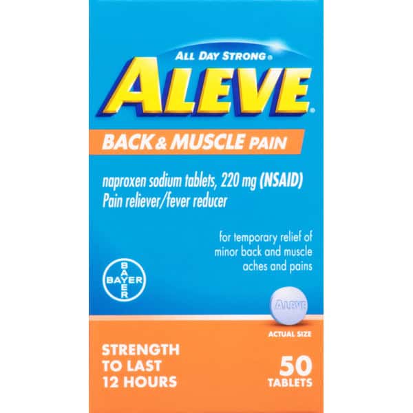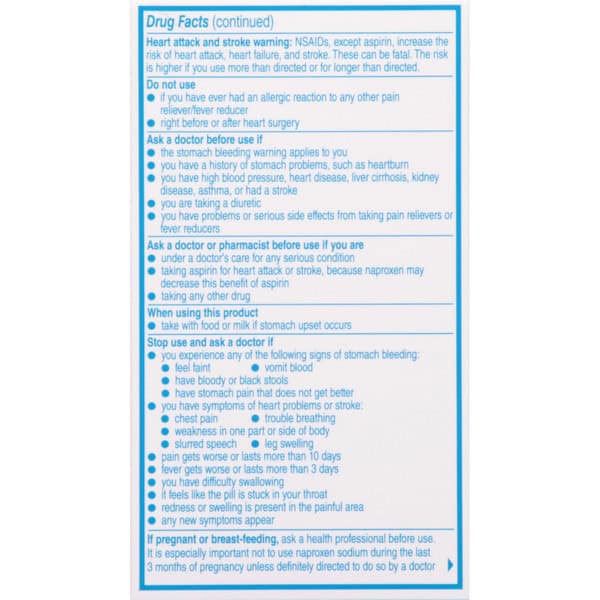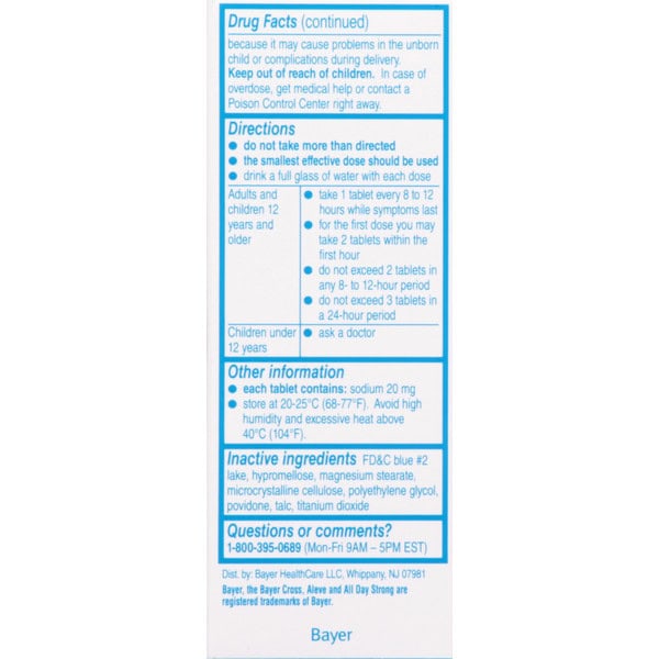 In Each Tablet: Warnings: Allergy Alert: Naproxen sodium may cause a severe allergic reaction, especially in people allergic to aspirin. Symptoms may include:: hives; facial swelling; asthma (wheezing); shock; skin reddening; rash; blisters. If an allergic reaction occurs, stop use and seek medical help right way. Stomach Bleeding Warning: This product contains an NSAID, which may cause severe stomach bleeding. The chance is higher if you:: are age 60 or older; have had stomach ulcers or bleeding problems; take a blood thinning (anticoagulant) or steroid drug; take other drugs containing prescription or nonprescription NSAIDs (aspirin, ibuprofen, naproxen, or others); have 3 or more alcoholic drinks every while using this product; take more or for a longer time that directed. Heart Attack and Stroke Warning: NSAIDs, except aspirin, increase the risk of heart attack, heart failure, and stoke. These can be fatal. The risk is higher if you use more than directed or for longer than directed. Do not use: if you have ever had an allergic reaction to any other pain reliever/fever reducer; right before or after heart surgery. Ask a doctor before use if: the stomach bleeding warning applies to you; you have a history of stomach problems, such as heartburn; you have high blood pressure, heart disease, liver cirrhosis, kidney disease, asthma, or had a stroke; you are taking a diuretic; you have problems or serious side effects from taking pain relievers or fever reducers. Ask a doctor or pharmacist before use if you are: under a doctor’s care for any serious condition; taking aspirin for heart attack or stroke, because naproxen may decrease this benefit of aspirin; taking any other drug. When using this product take with food or milk if stomach upset occurs. Stop use and ask a doctor if: you experience any of the following signs of stomach bleeding: feel faint; vomit blood; have a bloody or black stools; have stomach pain that does not get better; you have symptoms of heart problems or stroke: chest pain; trouble breathing; weakness in one part or side of body; slurred speech; leg swelling; pain gets worse or lasts more than 10 days; fever gets worse or lasts more than 3 days; you have difficulty swallowing; it feels like the pill is stuck in your throat; redness or swelling is present in the painful area; any new symptoms appear. If pregnant or breast-feeding, ask a health professional before use. It is especially important not to use naproxen sodium during the last 3 months of pregnancy unless definitely directed to do so by a doctor because it may cause problems in the unborn child or complications during delivery. Keep out of reach of children. In case of overdose, get medical help or contact a Poison Control Center right away. Do not use if carton is open or if foil seal imprinted with Bayer HealthCare on bottle opening is missing or broken.
