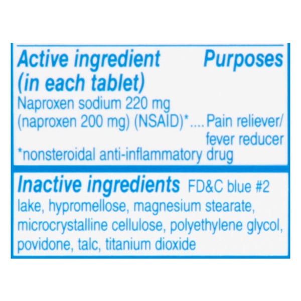 In Each Tablet: Active Ingredients: *Naproxen Sodium (Naproxen 200 mg) (NSAID) (220 mg), Pain Reliver/Fever Reducer. Inactive Ingredients: FD&C Blue 2 Lake, Hypromellose, Magnesium Stearate, Microcrystalline Cellulose, Polyethylene Glycol, Povidone, Talc, Titanium Dioxide.