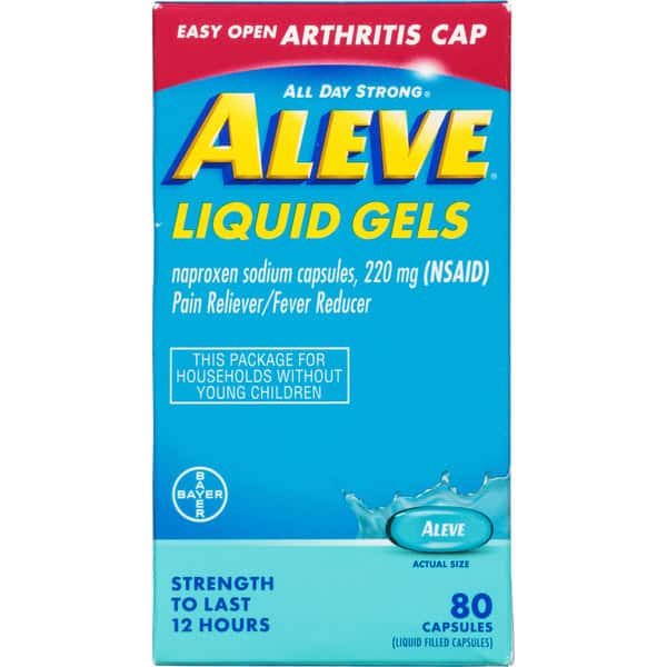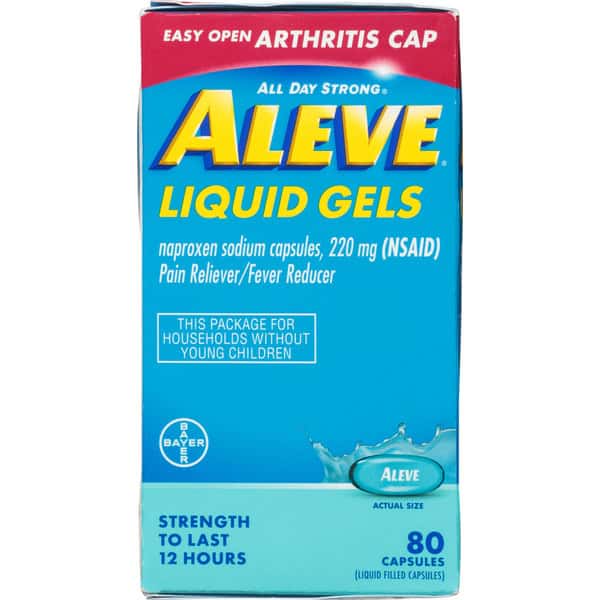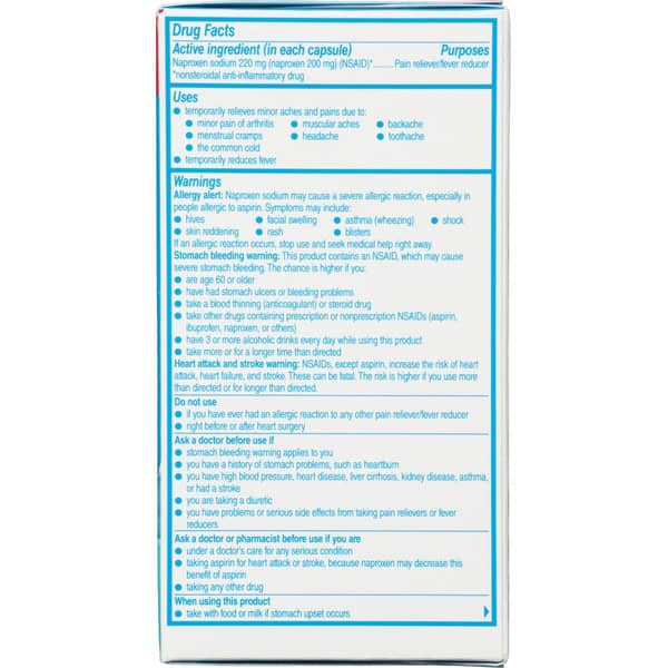 In Each Capsule: Active Ingredients: *Naproxen Sodium 220 mg (Naproxen 200 mg) (NSAID) (220 mg), Pain Reliever/Fever Reducer. Inactive Ingredients: FD&C Blue 1, Gelatin, Glycerin, Lactic Acid, Mannitol, Pharmaceutical Ink, Polyethylene Glycol, Povidone, Propylene Glycol, Purified Water, Sorbitan, Sorbitol.