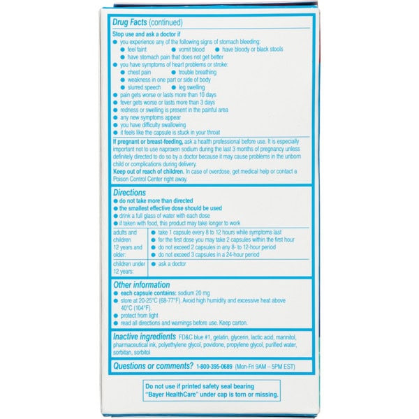 In Each Capsule: Warnings: Allergy alert: Naproxen sodium may cause a sever allergic reaction, especially in people allergic to aspirin, Symptoms may include:: hives; facial swelling; asthma (wheezing); shock; skin reddening; rash; blisters. If an allergic reaction occurs, stop use and seek medical help right away. Stomach bleeding warning: This product contains and NSAID, which may cause severe stomach bleeding. The chance is higher if you:: are age 60 or older; have had stomach ulcers or bleeding problems; take a blood thinning (anticoagulant) or steroid drug; take other drugs containing prescription or nonprescription NSAIDs (aspirin, ibuprofen, naproxen, or others); have 3 or more alcoholic drinks every day while using this product; take more or for a longer time than directed. Heart attack and stroke waning: NSAIDs, except aspirin, increase the risk of heart attack, heart failure, and stroke. These can be fatal. The risk is higher if you use more than directed or for longer than directed. Do not use: if you have ever had an allergic reaction to any other pain reliever/fever reducer; right before or after heart surgery. Ask a doctor before use if: stomach bleeding warning applies to you; you have a history of stomach problems, such as heartburn; you have high blood pressure, heart disease, liver cirrhosis, kidney disease, asthma, or had stroke; you are taking diuretic; you have problems or serious side effects from taking pain relievers or fever reducers. Ask a doctor or pharmacist before use if you are: under a doctor’s care for any serious condition; taking aspirin for heart attack or stroke, because naproxen may decrease this benefit of aspirin; taking any other drug. When using this product: take with food or milk if stomach upset occurs. Stop use and ask a doctor if: You experience any of the following signs of stomach bleeding: feel faint; vomit blood; have bloody or black stools; have stomach pain that does not get better; you have symptoms of heart problems or stroke: chest pain; trouble breathing; weakness in one part or side of body; slurred speech; leg swelling; pain gets worse or lasts more than 10 days; fever gets worse or lasts more than 3 days; redness or swelling is present in the painful area; any new symptoms appear; you have difficulty swallowing; it feels like the capsules is stuck in your throat. If pregnant or breast-feeding, ask a health professional before use. It is especially important not to use naproxen sodium during the last 3 months of pregnancy unless definitely directed to do so by a doctor because it may cause problems in the unborn child or complications during delivery. Keep out of reach of children. In case of overdose, get medical help or contact a Poison Control Center right away. Do not use if printed safety seal bearing Bay HealthCare under cup is torn or missing.