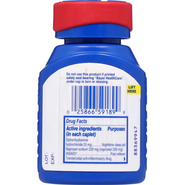 When using this product drowsiness will occur avoid alcoholic drinks do not drive a motor vehicle or operate machinery take with food or milk if stomach upset occurs. Ask a doctor before use If stomach bleeding warning applies to you you have problems or serious side effects from taking pain relievers or fever reducers you have a history of stomach problems, such as heartburn you have high blood pressure, heart disease, liver cirrhosis, kidney disease, asthma, or had a stroke you are taking a diuretic you have a breathing problem such as emphysema or chronic bronchitis you have glaucoma you have trouble urinating due to an enlarged prostate gland. Warnings Allergy alert: Naproxen sodium may cause a severe allergic reaction, especially in people allergic to aspirin. Symptoms may include: hives asthma (wheezing) skin reddening facial swelling shock rash blisters If an allergic reaction occurs, stop use and seek medical help right away. Stomach bleeding warning: This product contains an NSAID, which may cause severe stomach bleeding. The chance is higher if you: are age 60 or older have had stomach ulcers or bleeding problems take a blood thinning (anticoagulant) or steroid drug take other drugs containing prescription or nonprescription NSAIDs (aspirin, ibuprofen, naproxen, or others) have 3 or more alcoholic drinks every day while using this product take more or for a longer time than directed. Do not use if you have ever had an allergic reaction to any other pain reliever/fever reducer unless you have time for a full night’s sleep in children under 12 years of age right before or after heart surgery with any other product containing diphenhydramine, even one used on skin if you have sleeplessness without pain. It pregnant or breast-feeding, ask a health professional before use. It is especially important not to use naproxen sodium during the last 3 months of pregnancy unless definitely directed to do so by a doctor because it may cause problems in the unborn child or complications durĂng delivery. Keep out of reach of children. In case of overdose, get medical help or contact a Poison Control Center right away. have 3 or more alcoholic drinks every day while usng this product take more or for a longer time than directed Heart attack and stroke warning: NSAIDS, except aspirin, increase the risk of heart attack, heart failure, and stroke. These can be fatal. The risk is higher if you use more than directed or for longer than directed. Stop use and ask a doctor If you experience any of the following signs of stomach bleeding: feel faint have bloody or black stools have stomach pain that does not get better you have symptoms of heart problems or stroke: chest pain weakness in one part or side of body slurred speech pain gets worse or lasts more than 10 days sleeplessness persists continuously for more than 2 weeks. Insomnia may be a symptom of a serĂous underlying medical illness. redness or swelling is present in the painful area any new symptoms appear you have difficulty swallowing it feels like the pill is stuck in your throat vomit blood trouble breathing leg swelling. Ask a doctor or pharmaclst before use If you are taking sedatives or tranquilizers, or any other sleep-aid under a doctor’s care for any serious condition taking aspirin for heart attack or stroke, because naproxen may decrease this benefit of aspirin taking any other antihistamines taking any other drug.