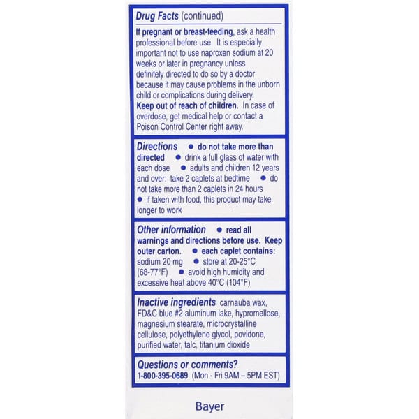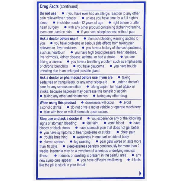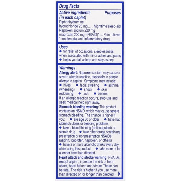 Do not use if you have ever had an allergic reaction to any other pain reliever/fever reducer unless you have time for a full night’s sleep in children under 12 years of age right before or after heart surgery with any other product containing diphenhydramine, even one used on skin if you have sleeplessness without pain Ask a doctor before use if you stomach bleeding warning applies to you you have problems or serious side effects from taking pain relievers or fever reducers you have a history of stomach problems, such as heartburn you have high blood pressure, heart disease, liver cirrhosis, kidney disease, asthma, or had a stroke you are taking a diuretic you have a breathing problem such as emphysema or chronic bronchitis you have glaucoma you have trouble urinating due to an enlarged prostate gland Ask a doctor or pharmacist before use if you are taking sedatives or tranquilizers, or any other sleep-aid under a doctor’s care for any serious condition taking aspirin for heart attack or stroke, because naproxen may decrease this benefit of aspirin taking any other antihistamines taking any other drug When using this product drowsiness will occur avoid alcoholic drinks do not drive a motor vehicle or operate machinery take with food or milk if stomach upset occurs Stop use and ask a doctor if you experience any of the following signs of stomach bleeding: feel faint vomit blood have bloody or black stools have stomach pain that does not get better you have symptoms of heart problems or stroke: chest pain trouble breathing weakness in one part or side of body slurred speech leg swelling pain gets worse or lasts more than 10 days sleeplessness persists continuously for more than 2 weeks. Insomnia may be a symptom of a serious underlying medical illness redness or swelling is present in the painful area any new symptoms appear you have difficulty swallowing if feels like the pill is stuck in your throat . Allergy alert: Naproxen sodium may cause a severe allergic reaction, especially in people allergic to aspirin. Symptoms may include: hives facial swelling asthma (wheezing) shock skin reddening rash blisters If an allergic reaction occurs, stop use and seek medical help right away. Stomach bleeding warning: This product contains an NSAID, which may cause severe stomach bleeding. The chance is higher if you: are age 60 or older have had stomach ulcers or bleeding problems take a blood thinning (anticoagulant) or steroid drug take other drugs containing prescription or nonprescription NSAIDS (aspirin, ibuprofen, naproxen, or others) have 3 or more alcoholic drinks every day while using this product take more or for a longer time than directed Heart attack and stroke warning: NSAIDs, except aspirin, increase the risk of heart attack, heart failure, and stroke. These can be fatal. The risk is higher if you use more than directed or for longer than directed. If pregnant or breast-feeding, ask a health professional before use. It is especially important not to use naproxen sodium during the last 3 months of pregnancy unless definitely directed to do so by a doctor because it may cause problems in the unborn child or complications during delivery. Keep out of reach of children. In case of overdose, get medical help or contact a Poison Control Center right away.
