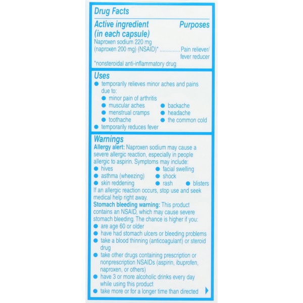 Ask a doctor or pharmacist before use if you are under a doctor’s care for serious condition taking aspirin for heart attack or stroke, because naproxen may decrease this benefit of aspirin taking any other drug When using this product take with food or milk if stomach upset occurs any Stop use and ask a doctor if you experience any of the following signs of stomach bleeding: feel faint have stomach pain that does not get better you have symptoms of heart problems or stroke: chest pain slurred speech pain gets worse or lasts more than 10 days fever gets worse or lasts more than 3 days redness or swelling is present in the painful area any new symptoms appear you have difficulty swallowing it feels like the capsule is stuck in your throat vomit blood have bloody or black stools weakness in one part or side of body leg swelling trouble breathing If pregnant or breast-feeding, ask a health professional before use. It is especially important not to use naproxen sodium during the last 3 months of. Heart attack and stroke warning: NSAIDS, except aspirin, increase the risk of heart attack, heart failure, and stroke. These can be fatal. The risk is higher it use more than directed or for longer than directed. Do not use . if you have ever had an allergic reaction to any other pain reliever/fever reducer . right before or after heart surgery. Stomach bleeding warning: This product contains an NSAID, which may cause severe stomach bleeding. The chance is higher if you: are age 60 or older have had stomach ulcers or bleeding problems take a blood thinning (anticoagulant) or steroid drug take other drugs containing prescription or nonprescription NSAIDS (aspirin, ibuprofen, naproxen, or others) have 3 or more alcoholic drinks every day while using this product take more or for a longer time than directed. Allergy alert: Naproxen sodium may cause a severe allergic reaction, especially in people allergic to aspirin. Symptoms may include: hives asthma (wheezing) skin reddening facial swelling shock rash blisters If an allergic reaction occurs, stop use and seek medical help right away. Ask a doctor before use if stomach bleeding warning applies to you you have a history of stomach problems, such as heatiu you have high blood pressure, heart disease, liver cirrhosis, keiney disease, asthma, or had a stroke you are taking a diuretic you have problems or serious side effects from taking pain relievers or fever reducers. pregnancy unless definitely directed to do so by a doctor because it may cause problems in the unborn child or complications during delivery. Keep out of reach of children. In case of overdose, get medical help or contact a Poison Control Center right away.