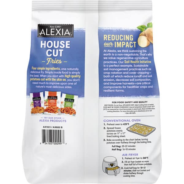 For Food Safety and Quality: Keep frozen. Do not thaw. Appliances vary. Adjust cooking times as needed. Food must be cooked thoroughly. Internal temperature needs to reach 165 degrees F (74 degrees C) as measured by a food thermometer in several spots. Read and follow these cooking directions. For more information go to alexiafoods.com or call 1-866-484-8676. Conventional Oven: 1. Preheat oven to 425 degrees F. 2. Spread frozen potatoes evenly across an 11 inches x 17 inches lined baking sheet. 3. Bake according to the chart below; turning potatoes over halfway through the baking time. Full Bag: 20-22 minutes. Half Bag: 16-18 minutes. Air Fryer: 1. Preheat air fryer to 360 degrees F. 2. Fill air fryer basket no more than half full of frozen potatoes. 3. Cook half bag for 10-12 minutes; slide out basket and shake halfway through cooking time.