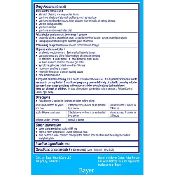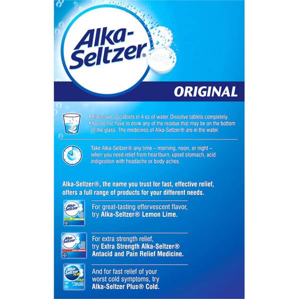 (In Each Tablet): Directions: Fully dissolve 2 tablets in 4 ounces of water before taking. Place two (2) tablets in 4 oz of water. Dissolve tablets completely. You do not have to drink any of the residue that may be on the bottom of the glass. The medicines of Alka-Seltzer are in the water. Take Alka-Seltzer any time – morning, noon, or night – when you need relief from heartburn, upset stomach, acid indigestion with headache or body aches. Adults and Children 12 Years and Over: 2 tablets every 4 hours, or as directed by a doctor. Do not exceed 8 tablets in 24 hours. Adults 60 Years and Over: 2 tablets every 4 hours, or as directed by a doctor. Do not exceed 4 tablets in 24 hours. Children Under 12 Years: Consult a doctor.
