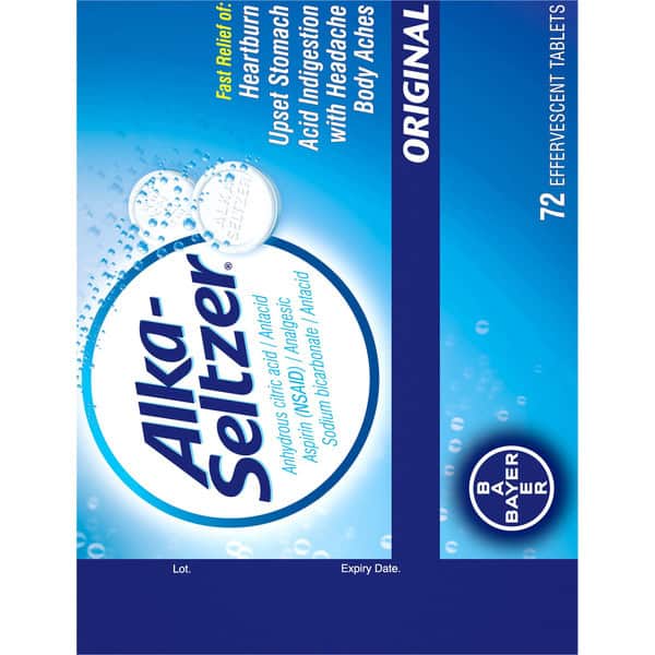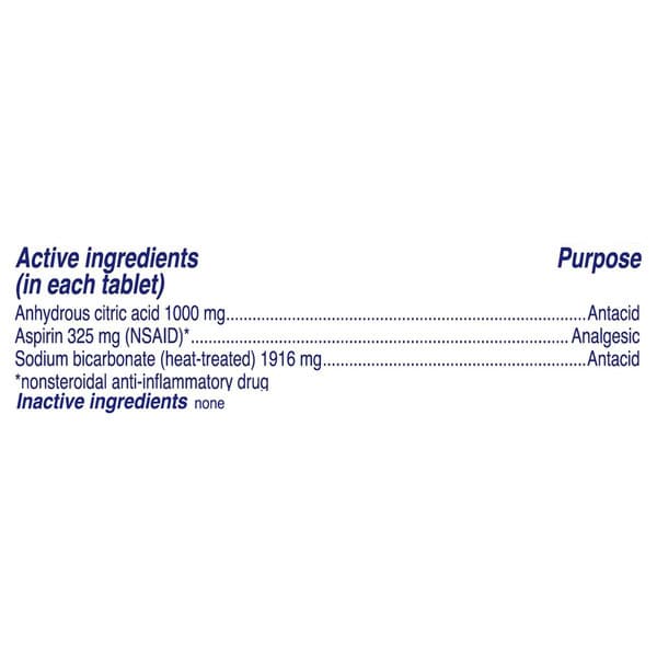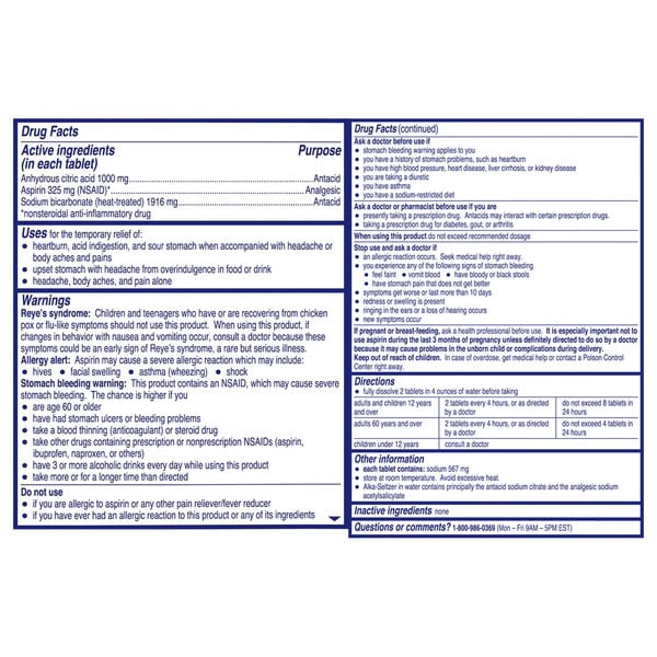 In Each Tablet Other Information: Each Tablet Contains: sodium 567 mg. Store at room temperature. Avoid excessive heat. Alka-Seltzer in water contains principally the antacid sodium citrate and the analgesic sodium acetylsalicylate. Anhydrous citric acid / Antacid aspirin (NSAID) / Analgesic. Sodium bicarbonate / Antacid. Fast Relief of: Heartburn; upset stomach; acid indigestion with headache; body aches. Questions or comments? 1-800-986-0369 (Mon – Fri 9am – 5 pm Est). Alka-Seltzer, the name you trust for fast, effective relief, offers a full range of products for your different needs. For great-tasting effervescent flavor, try Alka-Seltzer Lemon Lime. For extra strength relief, try Extra Strength Alka-Seltzer Antacid and Pain Relief Medicine. And for fast relief of your worst cold symptoms, try Alka-Seltzer Plus Cold. Made in Mexico.