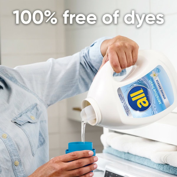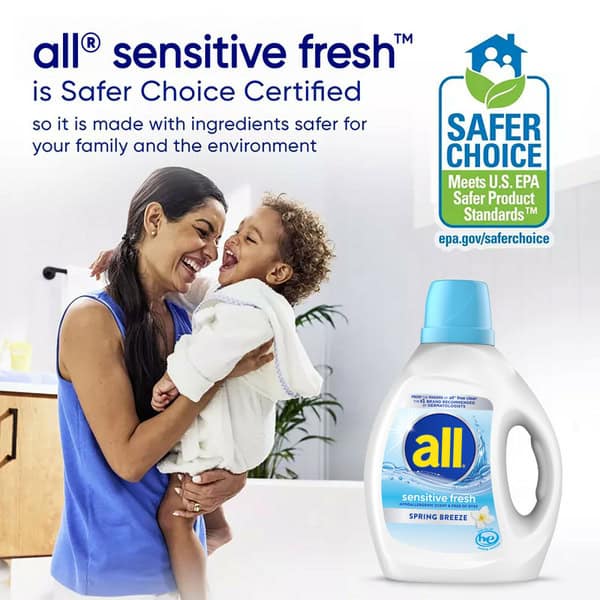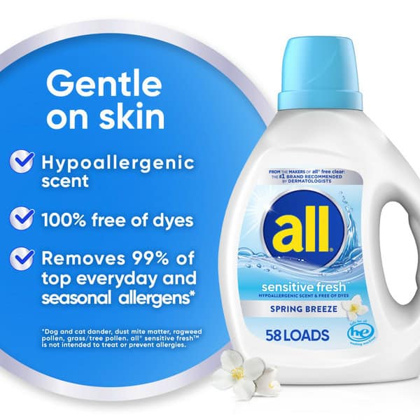 From the makers of all® free clear, the #1 Dermatologist recommended detergent brand for sensitive skin, all® sensitive fresh™ laundry detergent is formulated with a hypoallergenic scent and is 100% free of dyes. It offers a fresh smelling clean while being gentle on skin. all® sensitive fresh™ is safe to use in high efficiency (HE) washing machines and it cleans effectively in cold water.