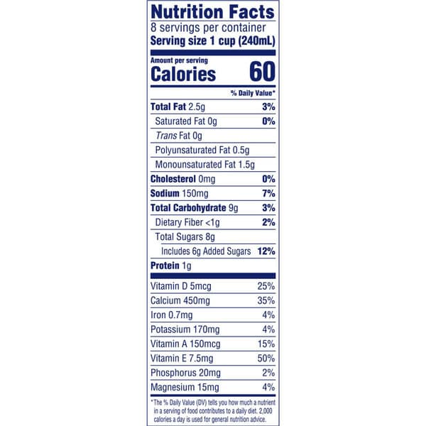Almondmilk (filtered Water, Almonds), Honey, Cane Sugar, Calcium Carbonate, Natural Flavors, Sea Salt, Potassium Citrate, Sunflower Lecithin, Gellan Gum, Vitamin A Palmitate, Vitamin D2, D-alpha-tocopherol (natural Vitamin E).