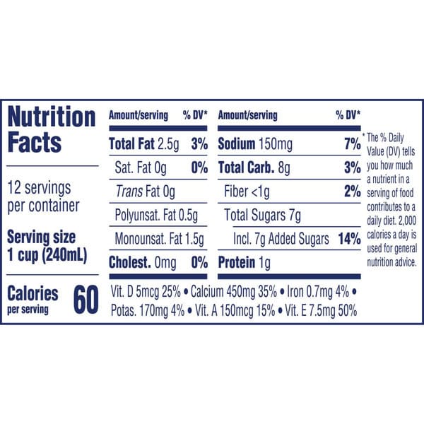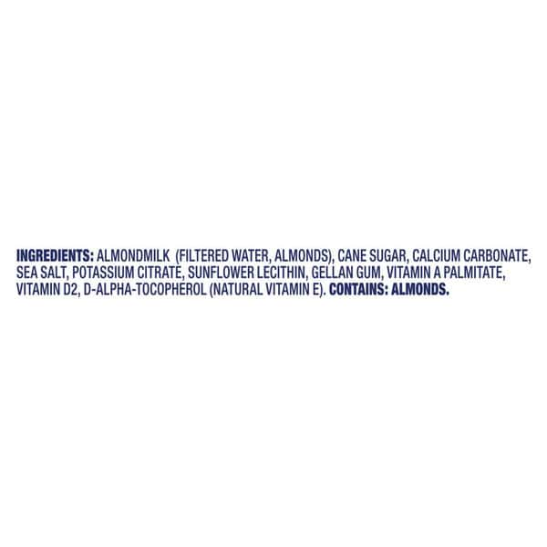Almondmilk (filtered Water, Almonds), Cane Sugar, Calcium Carbonate, Sea Salt, Potassium Citrate, Sunflower Lecithin, Gellan Gum, Vitamin A Palmitate, Vitamin D2, D-alpha-tocopherol (natural Vitamin E).