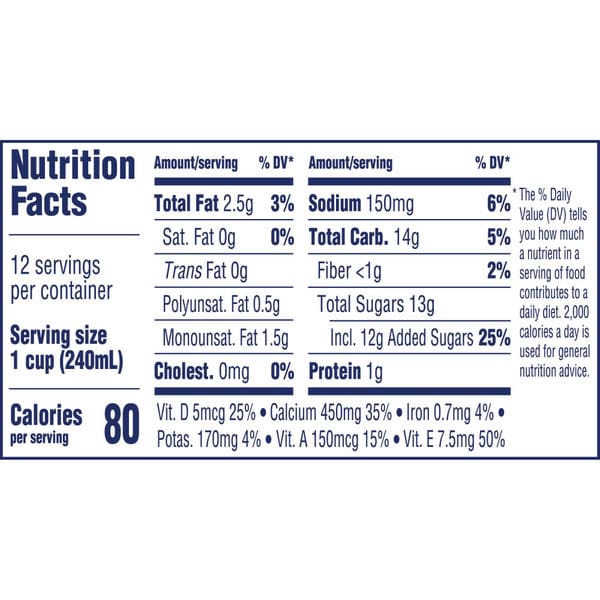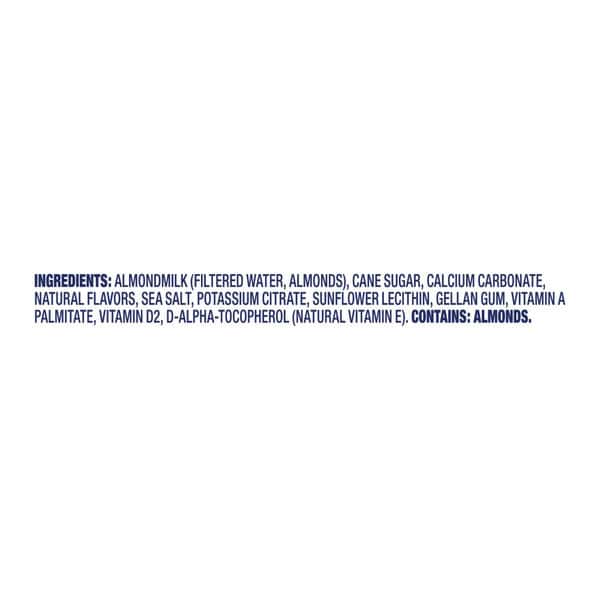 Almondmilk (filtered Water, Almonds), Cane Sugar, Calcium Carbonate, Natural Flavors, Sea Salt, Potassium Citrate, Sunflower Lecithin, Gellan Gum, Vitamin A Palmitate, Vitamin D2, D-alpha-tocopherol (natural Vitamin E).