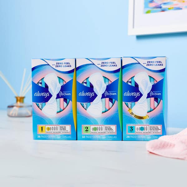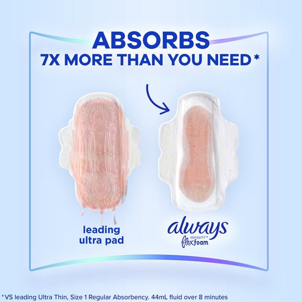 Try Always Infinity FlexFoam for a pad that feels like nothing and protects like nothing else! With Always Infinity FlexFoam Size 3 Extra Heavy Absorbency pads a Zero Leak and Zero Feel period is possible. FlexFoam pads absorb up to 10x their weight. FlexFoam pads are unbelievably thin and flexible, so your pad moves with you, not against you. Zero Feel protection is possible with our driest, breathable top layer, and super absorbent holes that pull wetness away from your skin. Always Infinity FlexFoam pads feature a breathable top layer and absorbent holes that pull fluid away from your body, keeping you dry. Always FlexFoam pads are dermatologically tested, and approved as skin friendly by the Skin Health Alliance. Always products are FSA/HSA Eligible. Are you getting the right protection from your pad? Using the wrong pad size can lead to leaks. Step up in size to help stop leaks. Now you can find your fit with Always MY FIT, a tailored sizing system to help you find the best protection based on both your flow AND panty size. Use the sizing chart in the images to find your fit for day and night. For great night protection, try Always Infinity Size 5, Extra Heavy Overnight pads.